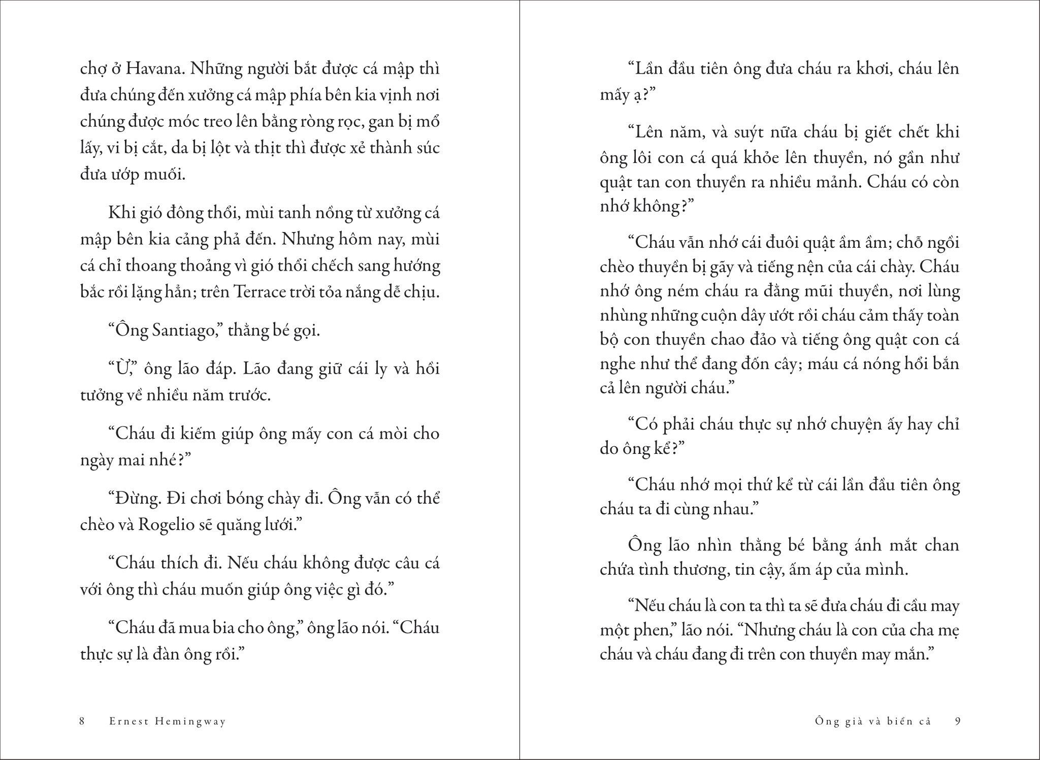 ÔNG GiÀ VÀ BIỂN CẢ kể về ông lão đánh cá nghèo khổ, một mình vật lộn ở đại dương ba ngày liền với con cá kiếm khổng lồ, không nản lòng, luôn tin tưởng sẽ đánh được một mẻ cá lớn xứng đáng với uy danh thời trai trẻ của mình. Cốt truyện hết sức đơn giản nhưng phô diễn nghệ thuật độc thoại nội tâm đạt tới mức đỉnh cao, theo nguyên lí tảng băng trôi của Hemingway. Tác phẩm như một bản hùng ca ca ngợi nghị lực và sức lao động phi thường của con ngườ
