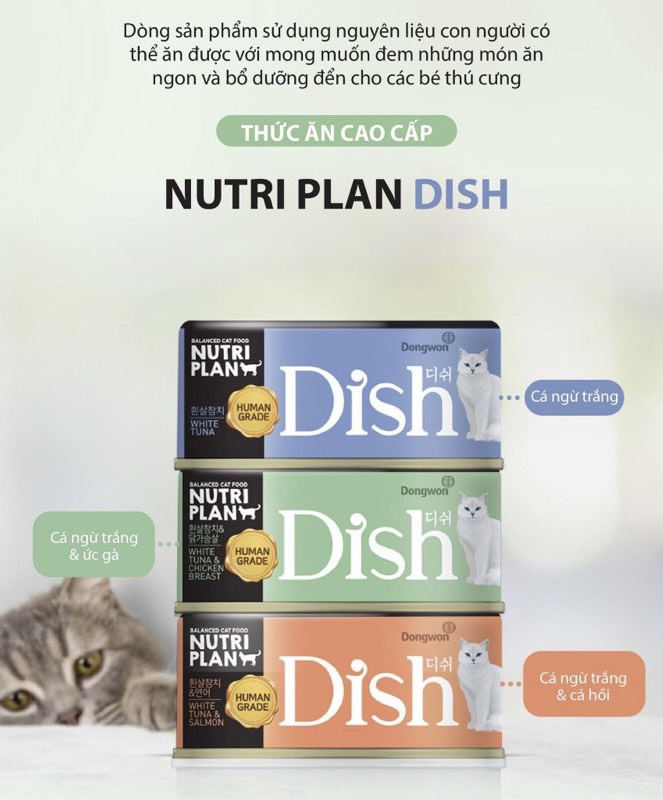 85gr - Pate Dongwon Dish cho Mèo lớn Mèo con thịt nguyên miếng thơm ngon nhập Hàn Quốc thành phần Cá Gà Sản xuất tại: Dongwon, 68 Mabang-ro, Seocho-gu, Seoul, Hàn Quốc Quy cách: 85g Pate cho mèo Dish là loại thức ăn dành riêng cho mèo, được sử dụng thành phần chính là cá & gà. Đây là loại thức ăn giàu protein, Taurine, axit amin và các khoáng chất khác rất tốt cho mèo. Đặc điểm sản phẩm Nguyên liệu chủ yếu là cá ngừ cá trắng thịt gà tươi ngon, tốt cho sức khỏe. Bổ sung các Axit amin cần thiết cho mèo như Taurine và Arginine. Bổ sung Probiotics (các vi khuẩn có lợi), hỗ trợ hệ tiêu hóa, nhuận tràng. Không sử dụng chất bảo quản, chất tạo vị, chất tạo đông. Thành phần dinh dưỡng Protein ≥ 11,8% Tro ≤ 1,3% Chất béo ≥ 0,15% Độ ẩm ≤ 98% Chất xơ thô ≤ 0,3% Các hương vị hiện có: 1. Dish White Tuna: vị Cá ngừ trắng Nguyên liệu: Cá ngừ vằn (thịt trắng), nước, nước cốt gà cô đặc, axit amin, chiết xuất cá minh thái khô, Probiotics. 2. Dish White Tuna & Salmon: vị Cá ngừ trắng & Cá hồi Nguyên liệu: Cá ngừ vằn (thịt trắng), nước, cá hồi, nước cốt gà cô đặc, axit amin, chiết xuất cá minh thái khô, Probiotics. 3. Dish White Tuna & Chicken: Cá ngừ trắng & Thịt gà Nguyên liệu: Cá ngừ vằn (thịt trắng), nước, ức gà, nước cốt gà cô đặc, axit amin, chiết xuất cá minh thái khô, Probiotics.