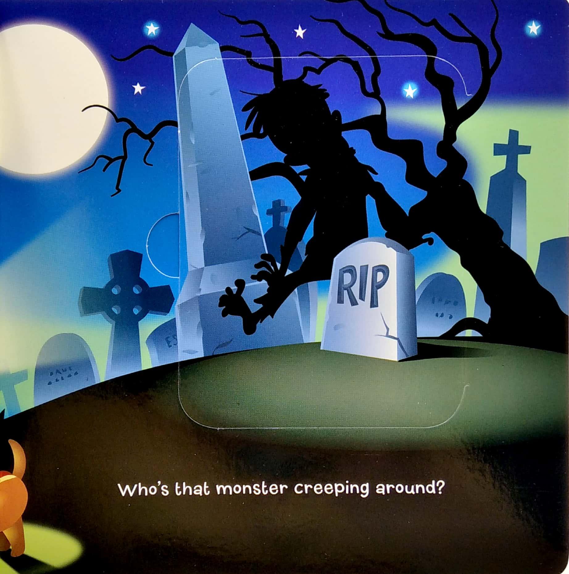 It's Halloween and it's spooky Ghosts, goblins, and witches are ready to fright! Up high in the , what could it be? Lift up the flap, and then you will see!