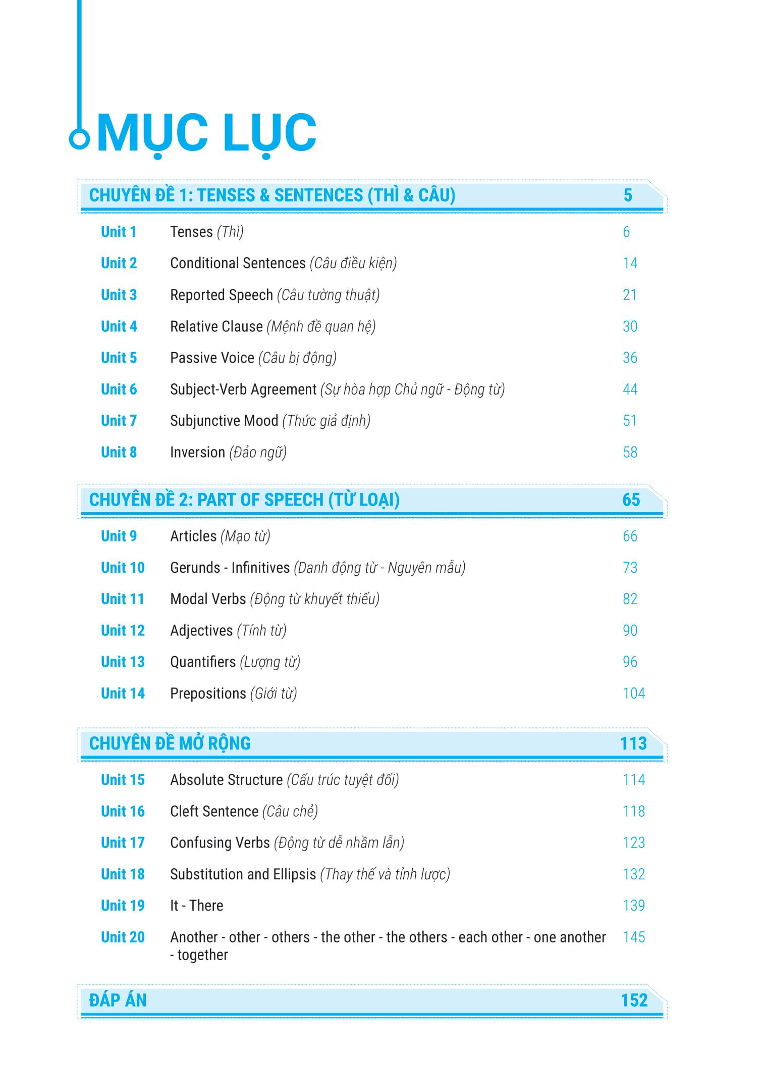 Mua tại TiktokPerfect English Grammar là bộ sách được ra đời với tiêu chí dễ hiểu, dễ ứng dụng, bám sát thực tế, giúp người học dễ dàng tiếp cận và hứng thú với việc học Ngữ pháp tiếng Anh. Tiếp nối Perfect English Grammar – Cẩm nang tự học toàn diện Ngữ pháp tiếng Anh – Basic là cuốn sách khởi đầu, đặt nền móng cho hành trình tự học Ngữ pháp tiếng Anh, Perfect English Grammar – Cẩm nang tự học toàn diện Ngữ pháp tiếng Anh – Advanced chính là cuốn sách nâng cao, giúp người học chinh phục toàn diện và làm chủ Ngữ pháp tiếng Anh. TỔNG QUAN CUỐN SÁCH Cuốn sách bao gồm 20 Chủ đề Ngữ pháp được chia thành 3 Chuyên đề lớn: