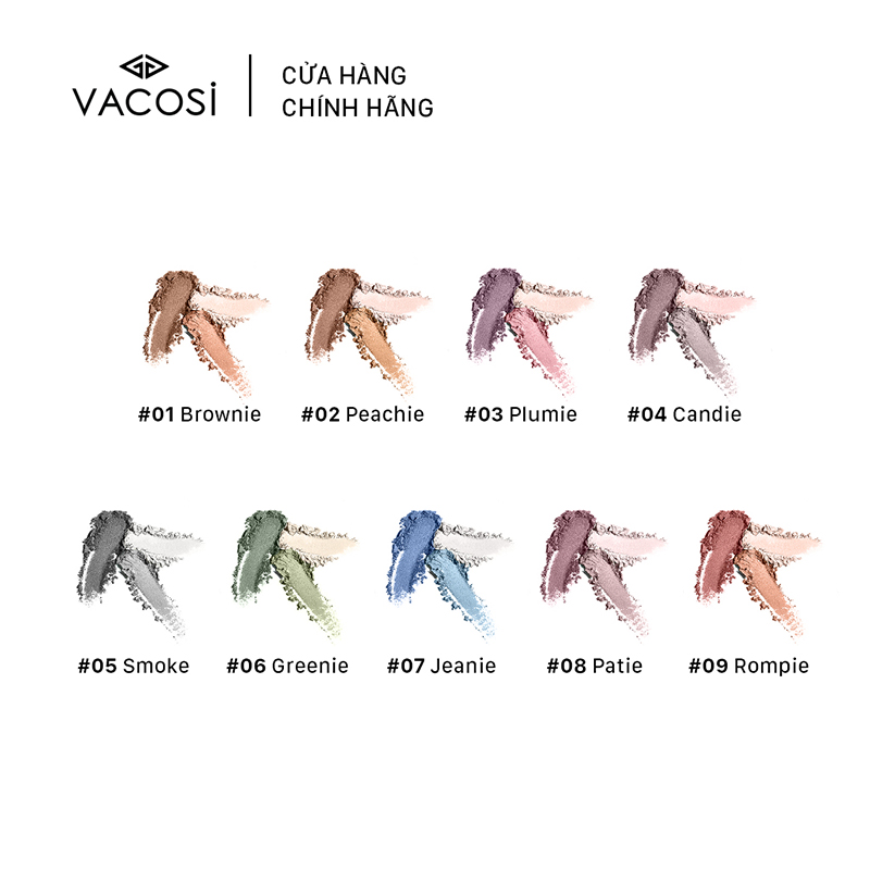 Mua tại TiktokPhấn mắt VACOSI có kết cấu từ các hạt nhỏ mịn giàu khoáng chất được nung ở nhiệt độ cao để tạo màu sắc sáng bóng, bền đẹp. Thiết kế dạng hộp tròn đơn giản và tiện lợi, thích hợp cho mục đích trang điểm cá nhân hoặc chuyên nghiệp. Mỗi hộp phấn mắt gồm 3 màu cùng tone. Bạn có thể tạo ra những màu mắt ưa thích bằng cách kết hợp các sắc màu này với nhau.