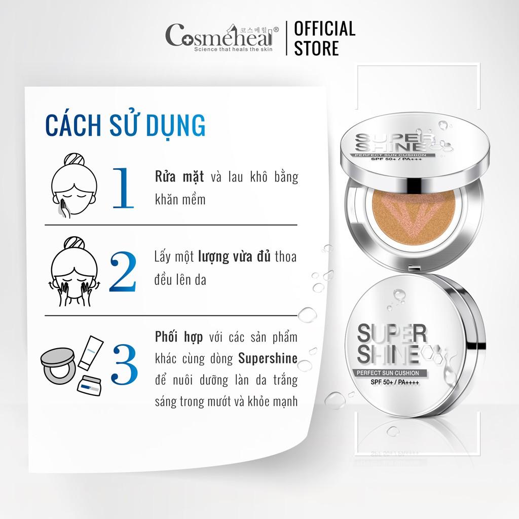 Mua tại TiktokSUPERSHINE Perfect Sun Cushion là phấn nước chứa chiết xuất tế bào gốc thực vật (trà xanh và hoa sen), kế thừa sự thành công của tế bào gốc siêu căng bóng SUPERSHINE Ampoule, với khả năng chống nắng cao, vừa có tác dụng che phủ, vừa nâng tone màu da, và đặc biệt có khả năng nuôi dưỡng và hồi phục làn da bằng dịch chiết tế bào gốc. & ƯU ĐIỂM