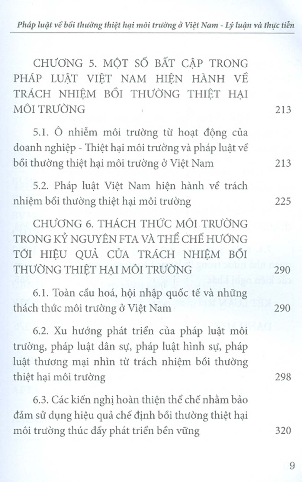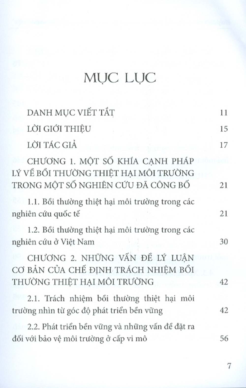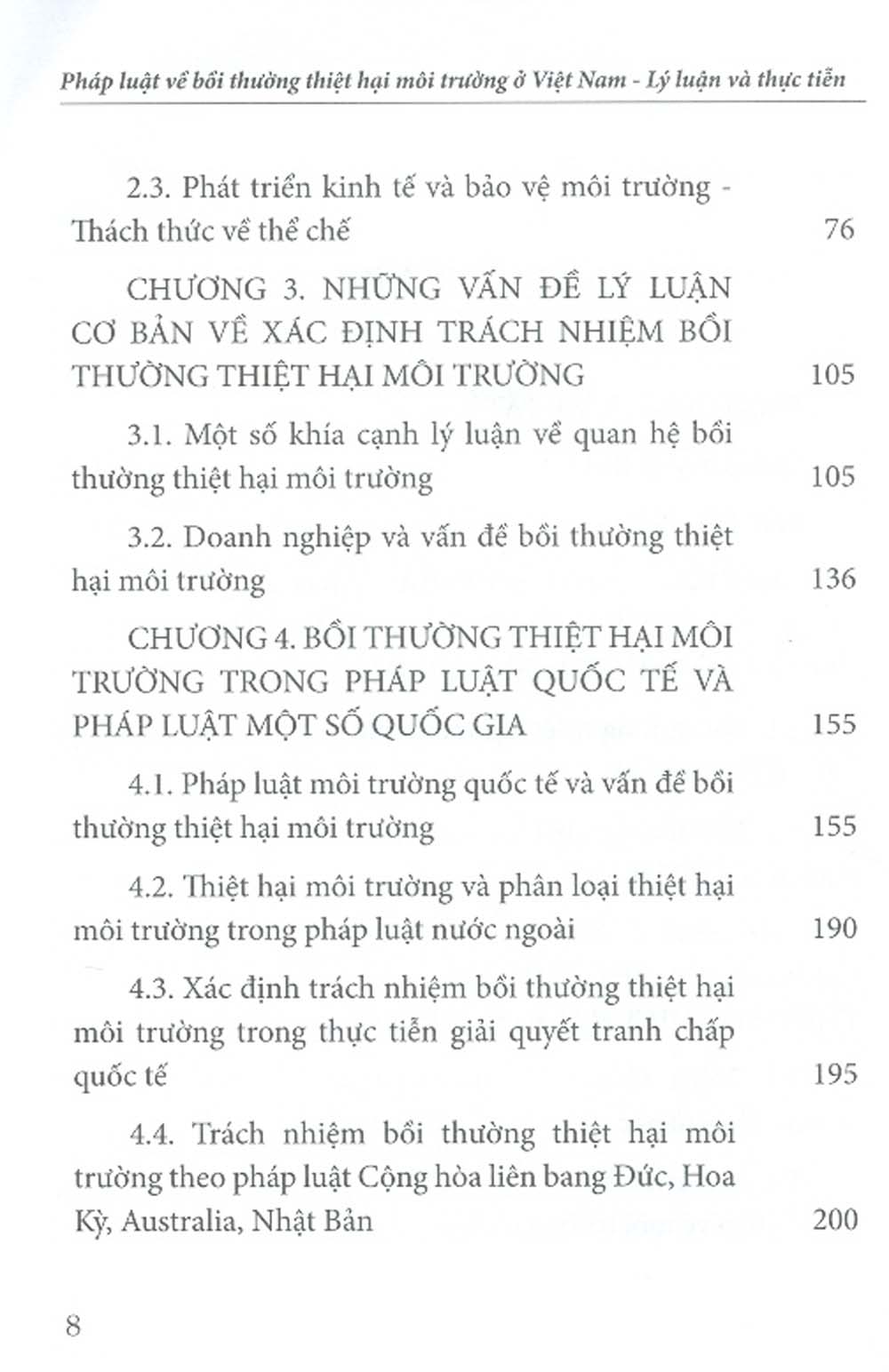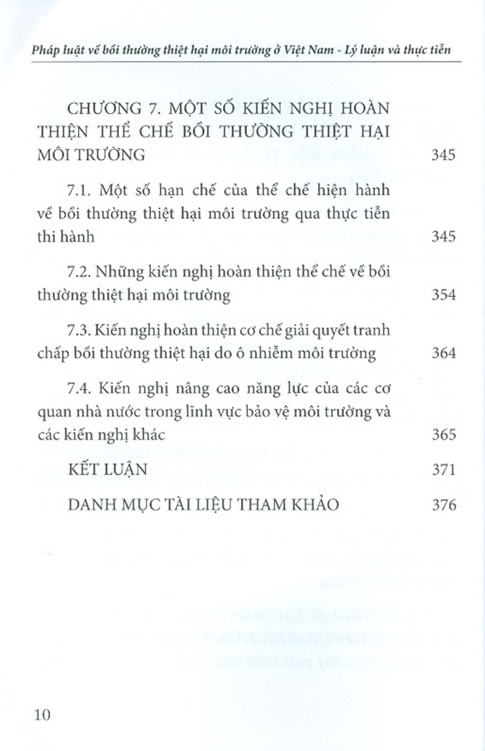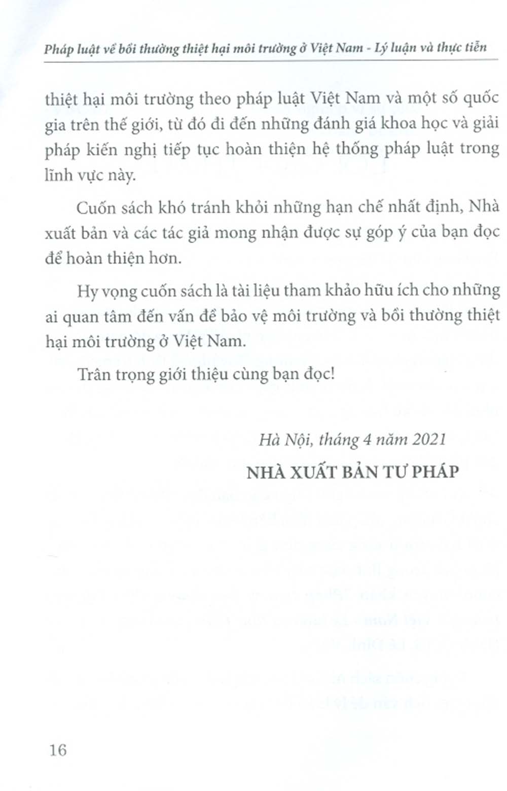 Hy vọng cuốn sách là tài liệu tham khảo hữu ích cho những ai quan tâm đến vấn đề bảo vệ môi trường và bồi thường thiệt hại môi trường ở Việt Nam.