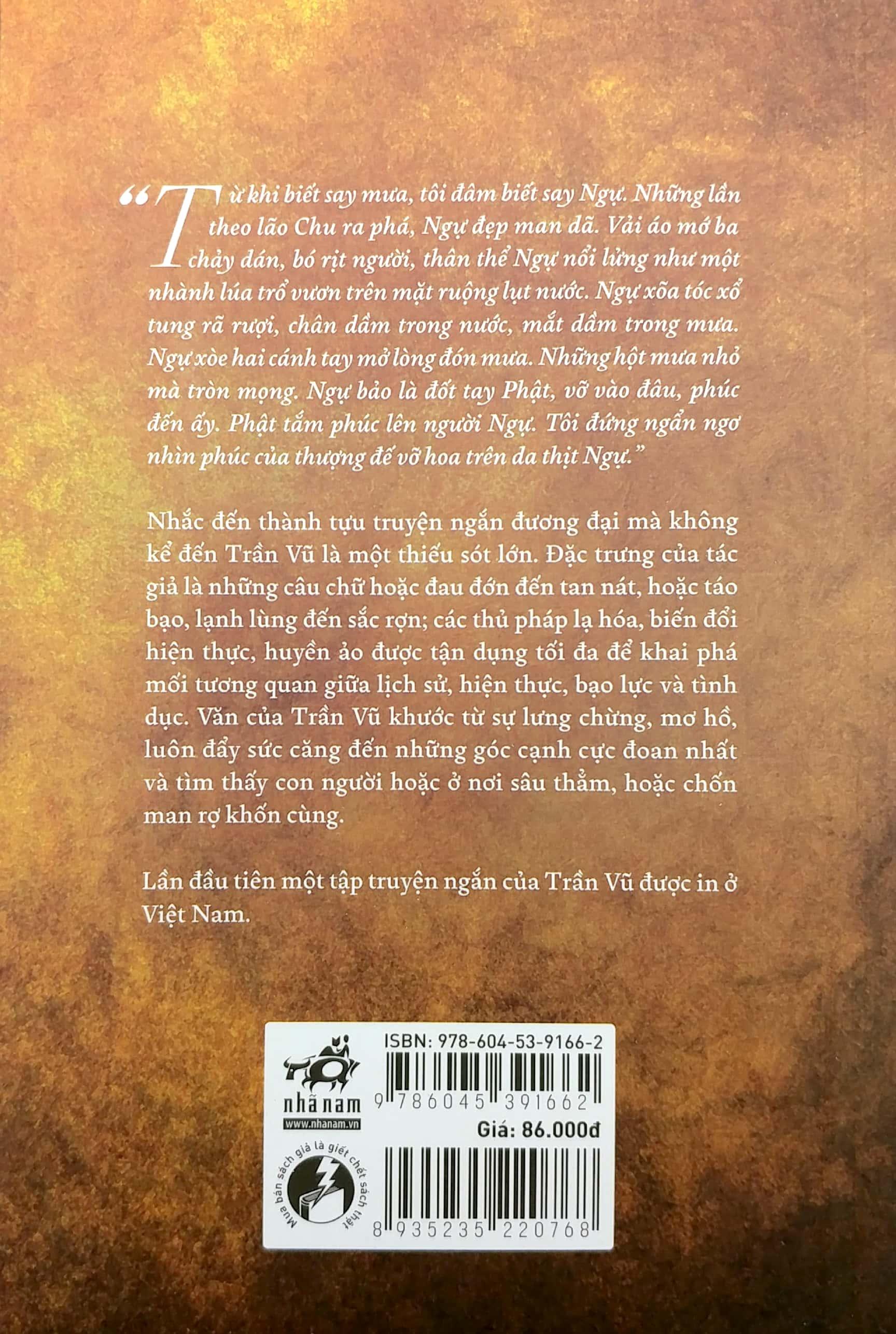 “Từ khi biết say mưa, tôi đâm biết say Ngự. Những lần theo lão Chu ra phá, Ngự đẹp man dã. Vải áo mớ ba chảy dán, bó rịt người, thân thể Ngự nổi lửng như một nhành lúa trổ vươn trên mặt ruộng lụt nước. Ngự xõa tóc xổ tung rã rượi, chân dầm trong nước, mắt dầm trong mưa. Ngự xòe hai cánh tay mở lòng đón mưa. Những hột mưa nhỏ mà tròn mọng. Ngự bảo là đốt tay Phật, vỡ vào đâu, phúc đến ấy. Phật tắm phúc lên người Ngự. Tôi đứng ngẩn ngơ nhìn phúc của thượng đế vỡ hoa trên da thịt Ngự.” Nhắc đến thành tựu truyện ngắn đương đại mà không kể đến Trần Vũ là một thiếu sót lớn. Đặc trưng của tác giả là những câu chữ hoặc đau đớn đến tan nát, hoặc táo bạo, lạnh lùng đến sắc rợn; các thủ pháp lạ hóa, biến đổi hiện thực, huyền ảo được tận dụng tối đa để khai phá mối tương quan giữa lịch sử, hiện thực, bạo lực và tình dục. Văn của Trần Vũ khước từ sự lưng chừng, mơ hồ, luôn đẩy sức căng đến những góc cạnh cực đoan nhất và tìm thấy con người hoặc ở nơi sâu thẳm, hoặc chốn man rợ khốn cùng. Lần đầu tiên một tập truyện ngắn của Trần Vũ được in ở Việt Nam