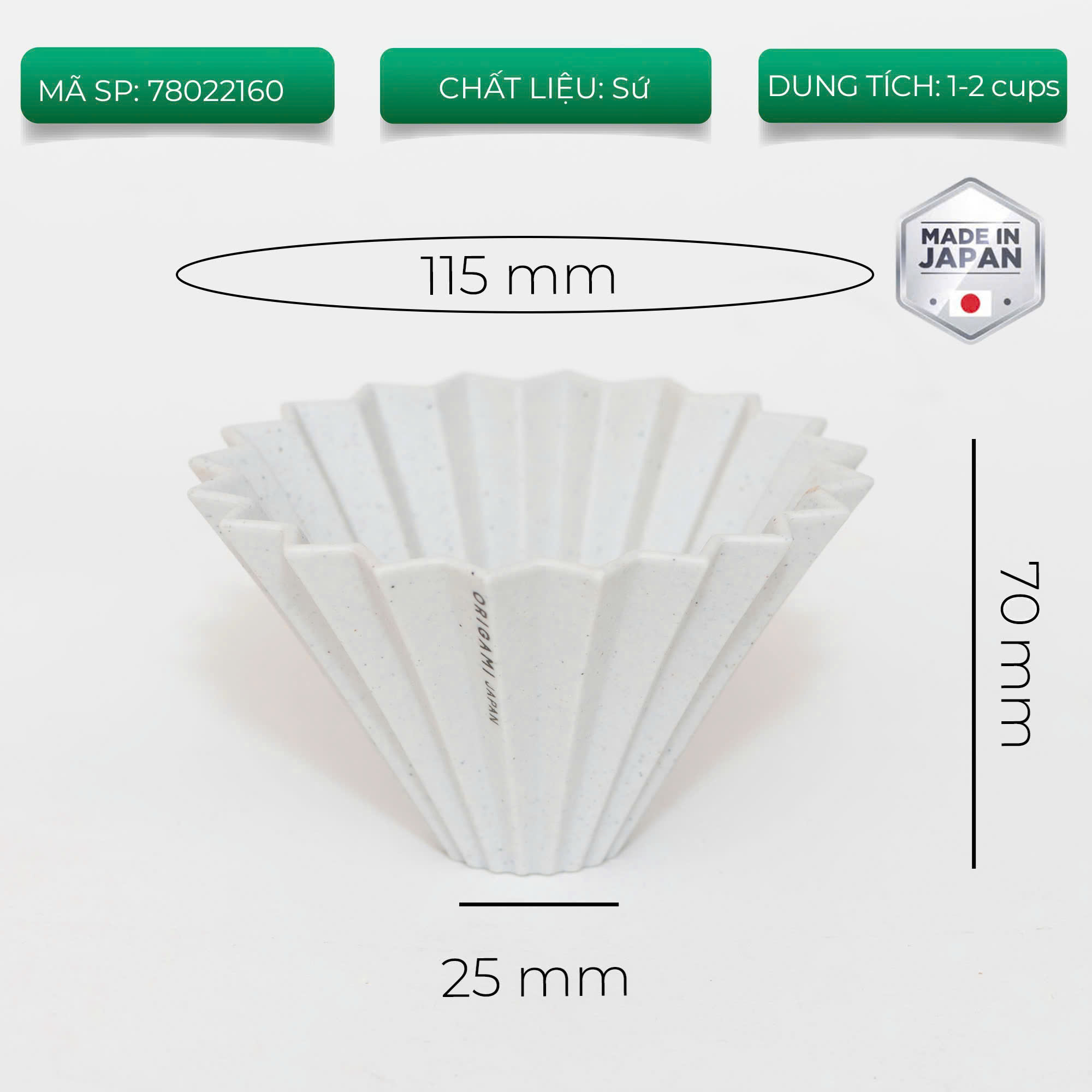 - Sản phẩm chính hãng, xuất xứ Nhật Bản Mô tả chi tiết: Nghệ thuật gấp giấy Origami Nhật Bản ngày nay có sức hút rất lớn và vẫn không ngừng lan tỏa ra khắp thế giới. Để làm ra một tác phẩm Origami cần rất nhiều sự tỉ mỉ và chau chuốt đến từng đường gấp. Được lấy cảm hứng từ môn nghệ thuật Origami kết hợp cùng với nền gốm sứ lâu đời của Nhật đã tạo ra sự ra đời của phễu lọc cà phê Origami. Từ việc luyện đất, nặn, nung, tráng men, đều hoàn toàn được làm thủ công. Toàn bộ quá trình phải dựa hoàn toàn vào sự khéo léo và kinh nghiệm của người nghệ nhân để duy trì chất lượng cao của sản phẩm. Phễu Origami được phát triển để tạo ra những ly cà phê Pour-over hoàn hảo. Origami là phễu lọc cà phê được làm hoàn toàn từ gốm sứ Mino (loại sứ cao cấp với 400 năm lịch sử của Nhật Bản). Gốm sứ Mino có chất lượng rất cao với khả năng dẫn nhiệt và giữ nhiệt tốt. Hình dạng độc đáo của Origami với 20 đường rãnh gấp, tạo điều kiện cho không khí lưu thông giữa phễu và giấy lọc, giúp ổn định tốc độ dòng chảy. Cà phê được tạo điều kiện có thể nở hết cỡ, đồng thời đặc tính của hạt cà phê được phát huy tối đa. Phễu có thiết kế hình nón, khi kết hợp với giá đỡ Origami, phễu tương thích với hầu hết các bình server đựng cà phê trên thị trường. Điểm đặc biệt của phễu lọc Origami đó là có thể được sử dụng với các loại giấy lọc V60, giấy Kalita và Kalita Wave, mang lại cho bạn sự linh hoạt trong việc pha chế. LƯU Ý ĐẶC ĐIỂM CỦA SỨ MINO TỪ NHÀ SẢN XUẤT CHÚNG TÔI MUỐN BẠN HIỂU VỀ ĐẶC ĐIỂM CỦA ĐỒ GỐM SỨ Các hiện tượng sau đây có thể xảy ra đối với 1 sản phẩm sứ hoàn hảo, điều này là không thể tránh khỏi trong quá trình sản xuất. Và Vui lòng lưu ý đây là đặc điểm tự nhiên của sản phẩm sứ (Không phải sản phẩm nào cũng có).