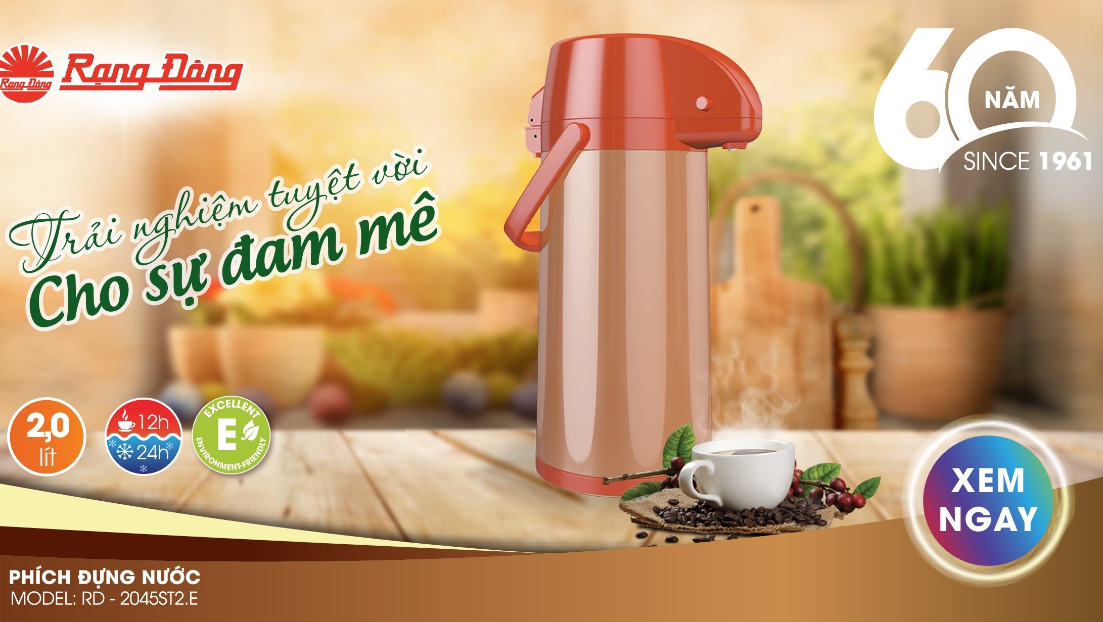 Mua tại TiktokPhích đựng nước dạng nút ấn 2 lít Rạng Đông Thương hiệu: Rạng Đông Bảo hành: 12 tháng Model: RD-2045ST2.E Dung tích: 2L Vật liệu: Thân Inox xước mạ màu, ruột thủy tinh, vai nhựa, gioăng Silicon Rót nước: Dạng nút ấn Đế xoay 360 độ tiện lợi Thời gian giữ nhiệt: Giữ nóng 12 giờ, giữ lạnh 24 giờ Sản phẩm được chứng nhận phù hợp Quy chuẩn kỹ thuật vệ sinh an toàn. Nút ấn dễ thao tác, thuận tiện khi sử dụng, chỉ ấn và rót. Thân Inox màu độc đáo (đỏ đậm và vàng chanh), sơn phủ chống vân tay. Ruột thủy tinh cao cấp giữ nhiệt cao, an toàn vệ sinh thực phẩm.