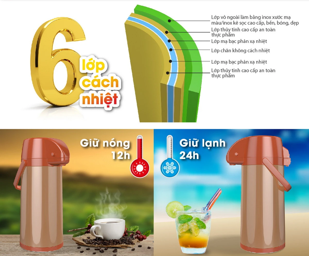 • Inox 304 sơn tĩnh điện sang trọng, bền đẹp theo thời gian • Lõi inox siêu bền, chống vỡ nổ – sử dụng gần như vĩnh cửu Khả năng giữ nhiệt vượt trội: •