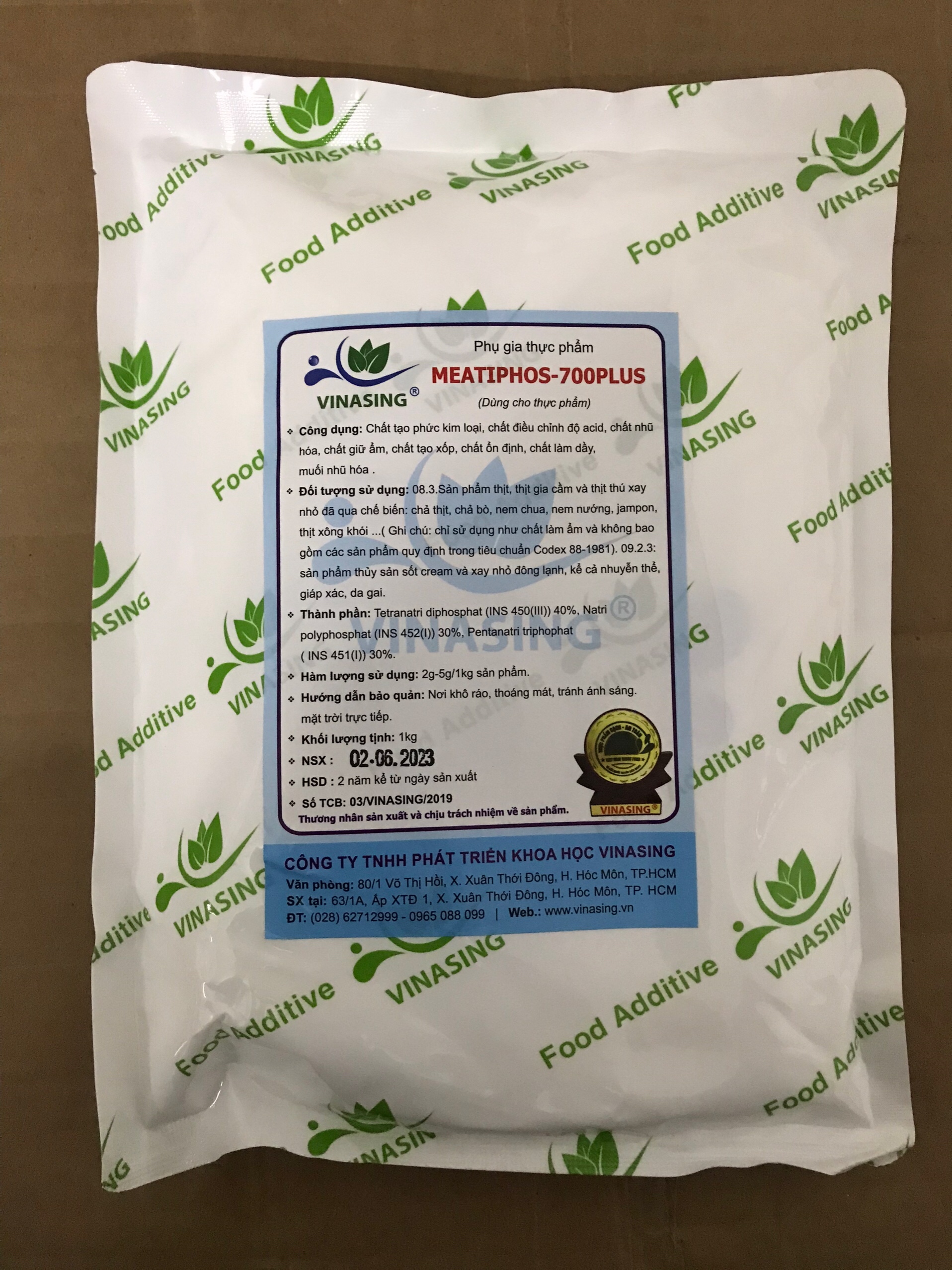 Meatiphos 700Plus - Công dụng: Dùng làm chất làm dầy, chất giữ ẩm,chất ổn định, chất làm bóng, chất làm rắn chắc. - Liều lượng sử dụng: 2g-5g/1 kg sản phẩm. - Đối tượng sử dụng: 08.3.Sản phẩm thịt, thịt gia cầm và thịt thú nhỏ đã qua chế biến: Chả thịt, chả bò, nem chua, nem nướng, jampon, thịt xông khói…Ghi chú:
