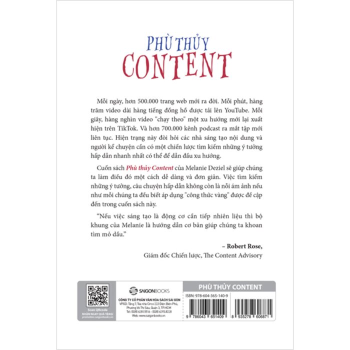 Tác giả Melanie là người tiên phong trong lĩnh vực marketing nội dung và là một trong những bộ óc thông minh nhất trong ngành. Trong khi có rất nhiều bộ khung chiến lược nội dung rối rắm với 47 ô và các mũi tên chĩa vào nhau thì Phù thủy content lại rất đơn giản, dễ tiếp cận và sẽ giúp bạn sáng tạo các ý tưởng kể chuyện hay hơn.