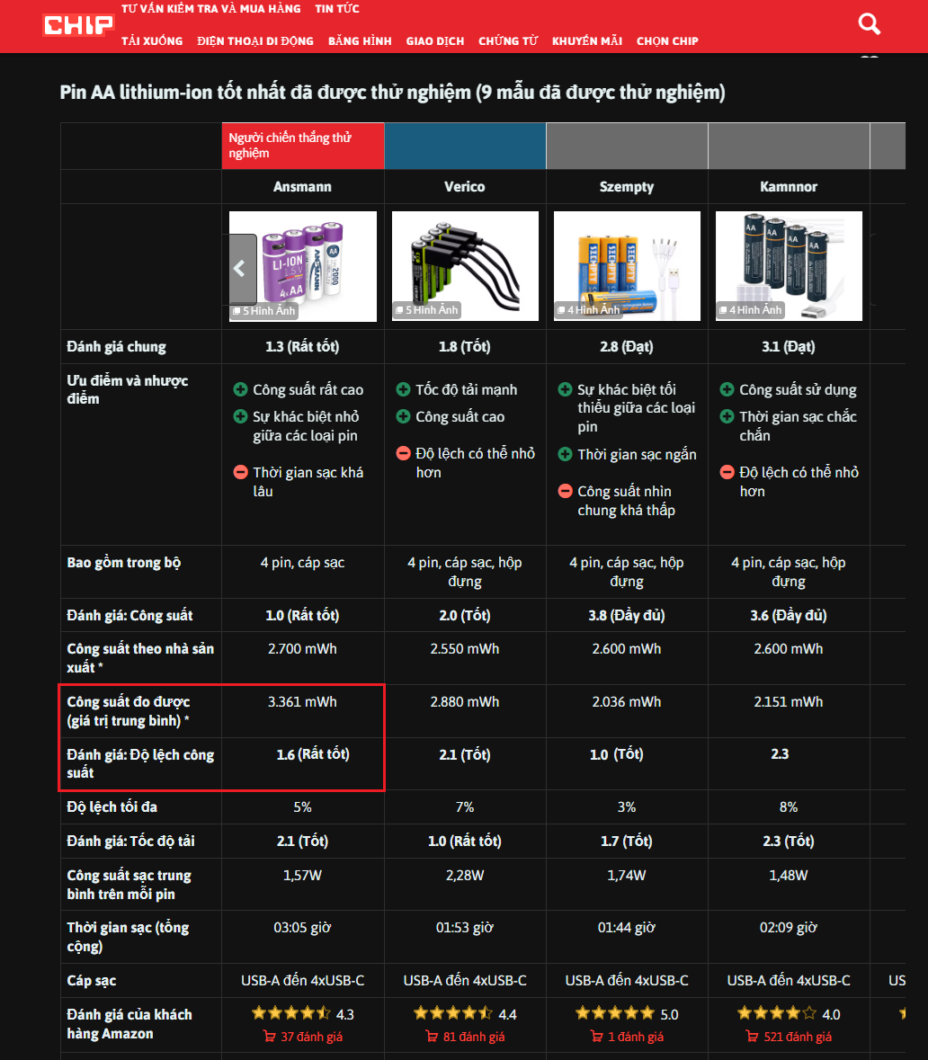 Về chất lượng, Pin Li-ion AA AMSMANN được (chip.de) hiệp hội tư vấn, đánh giá các sản phẩm tiêu dùng tại Đức bình chọn là sản phẩm tốt nhất trong 9 sản phẩm tương tự có trên thị trường