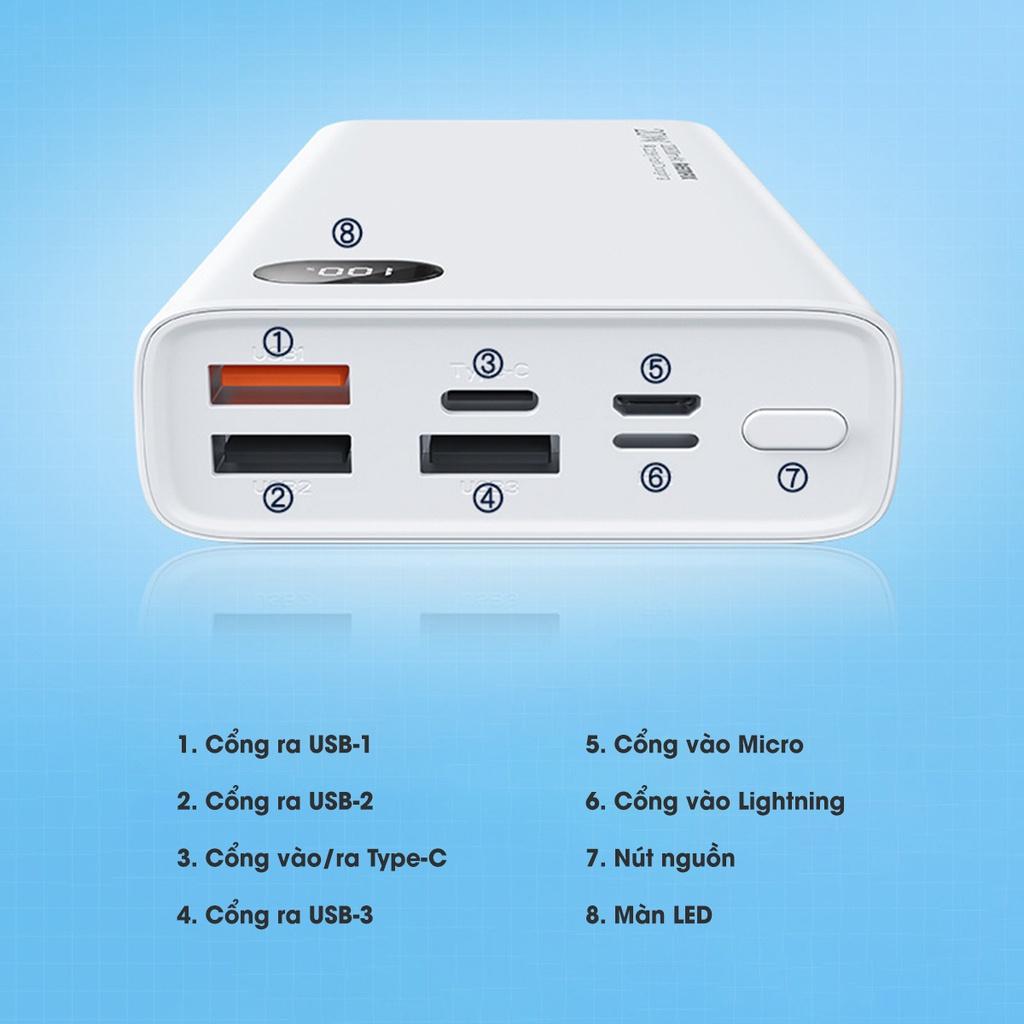 Tính năng Dung lượng 10.000mAh tương ứng 37Wh cung cấp đến nhiều giờ sử dụng cho các thiết bị điện tử 3 cổng sạc ra gồm 1 USB-A và 2 USB-C, thoải mái sạc 3