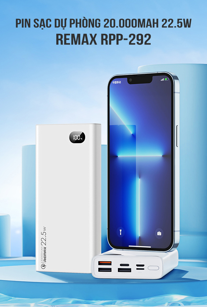 - Sạc dự phòng không dây 20000mAh Remax RPP-207 sạc nhanh không dây 15W, 3 cổng có dây 22.5W. - Cổng sạc không dây 15W - 3 cổng sạc có dây: 2*USB chuẩn QC 22.5W;