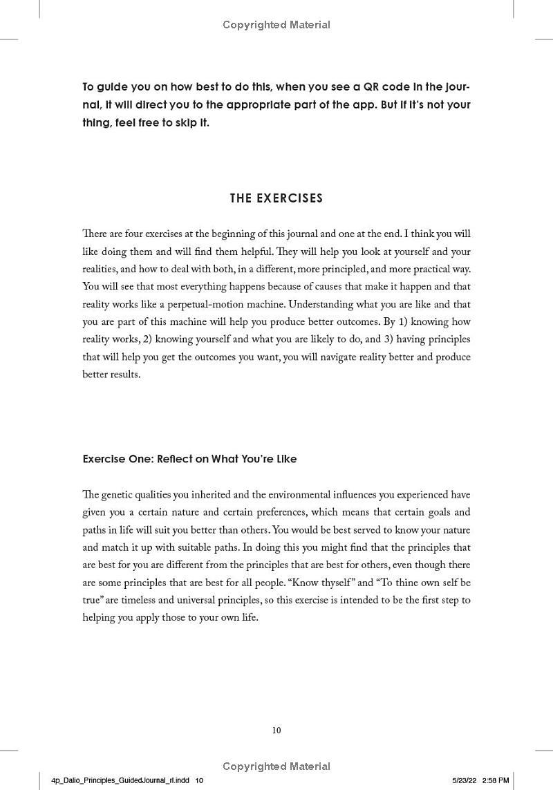 4. How to maximize your learning from your mistakes (which are inevitable) All of these exercises can optionally be enhanced using the free Principles in Action iOS and Android app (currently available in the United States, UK, Germany, Spain, and India with more countries to come), which provides an even more interactive, multimedia experience, and they are followed by a number of blank journal pages containing thought-provoking and unconventional prompts from Principles aimed at helping you formulate your own principles. The experience concludes with a structured reflection on where you and your loved ones are along life’s journey, leaving you with a highly personalized, practical playbook for achieving success in the years ahead. Read less