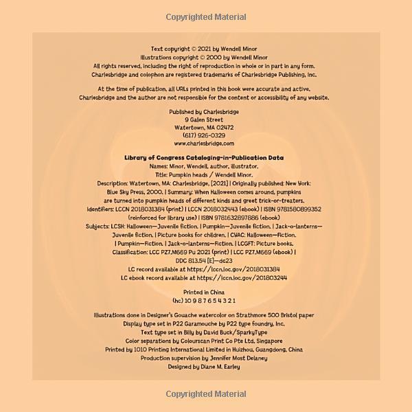Award-winning author and artist Wendell Minor uses simple language and striking autumn settings to celebrate jack-o'-lanterns in this reissue of a Halloween classic. The perfect holiday read aloud, Pumpkin Heads takes readers and trick-or-treaters from the pumpkin patch for picking, all the way home for carving, and gets everyone in the Halloween spirit.