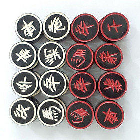 Quân cờ sừng đên hai bên, 16 quân chữ mầu trắng và 16 quân chữ mầu đỏ, quân cờ sừng trâu đen.
