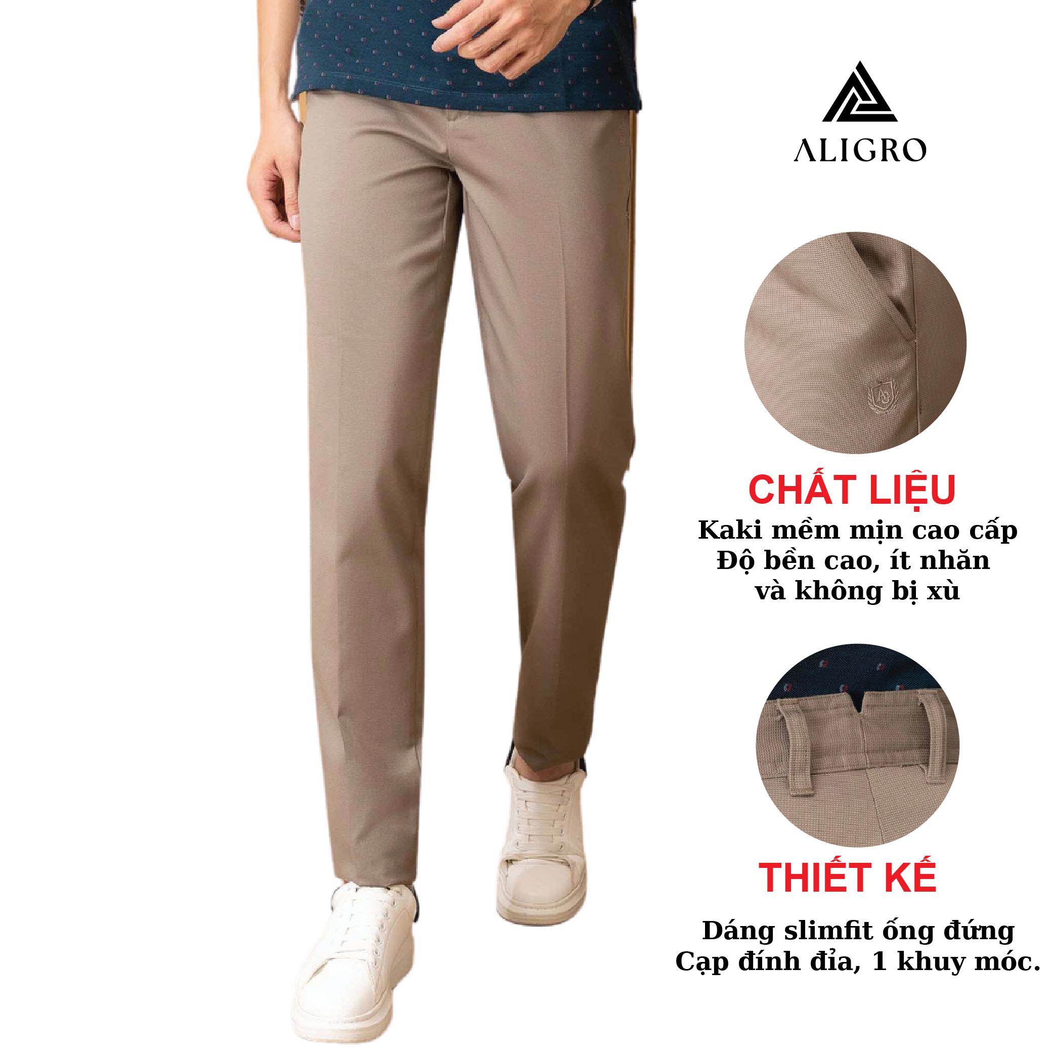 Mua tại TiktokGIỚI THIỆU THƯƠNG HIỆU Mang trong mình tầm nhìn chiến lược trở thành thương hiệu “Thời trang nam được yêu thích nhất Việt Nam” nên Aligro luôn chú trọng nghiên cứu phát triển mẫu mã, phom dáng phù hợp với vóc dáng hình thể đàn ông Việt. Sản phẩm của chúng tôi mang tới hình ảnh trẻ trung, năng động, hiện đại mà không kém phần lịch sự, sang trọng - cam kết mang lại giá trị đích thực và một cuộc sống thịnh vượng hơn cho phái mạnh Việt. CHI TIẾT THIẾT KẾ QUẦN KAKI NAM ALIGRO