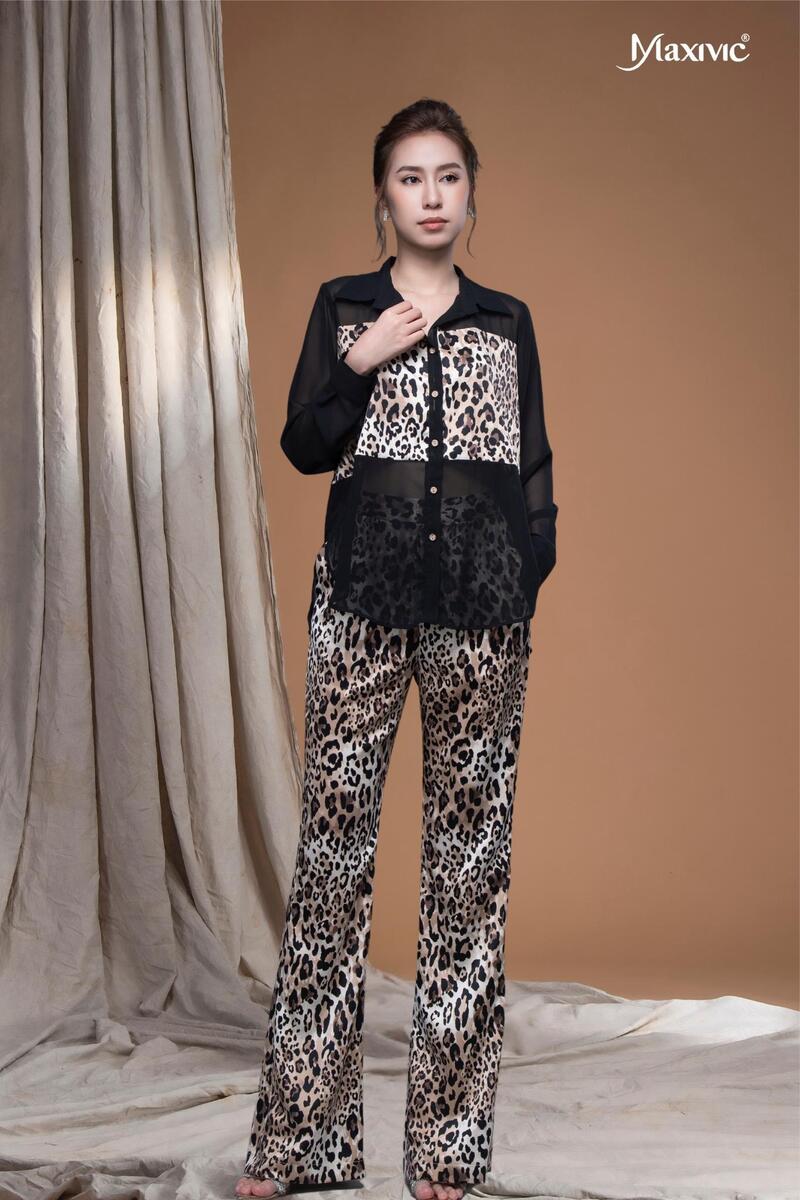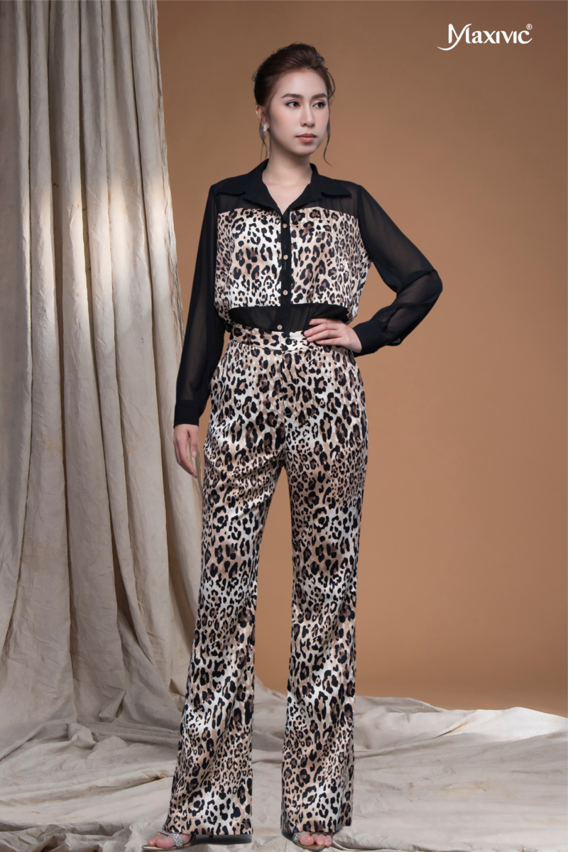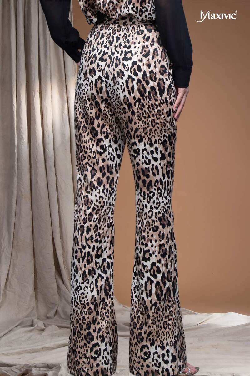 - Chất liệu: Vải lụa cát Hàn Quốc - Quần ống loe nhẹ, lưng cao hoạ tiết da beo giúp che khuyết điểm tốt, mang lại sự thanh lịch và thoải mái cho người mặc.