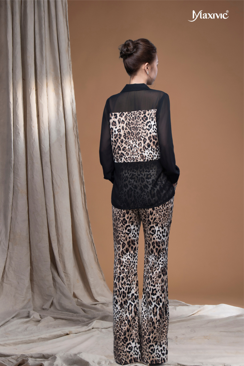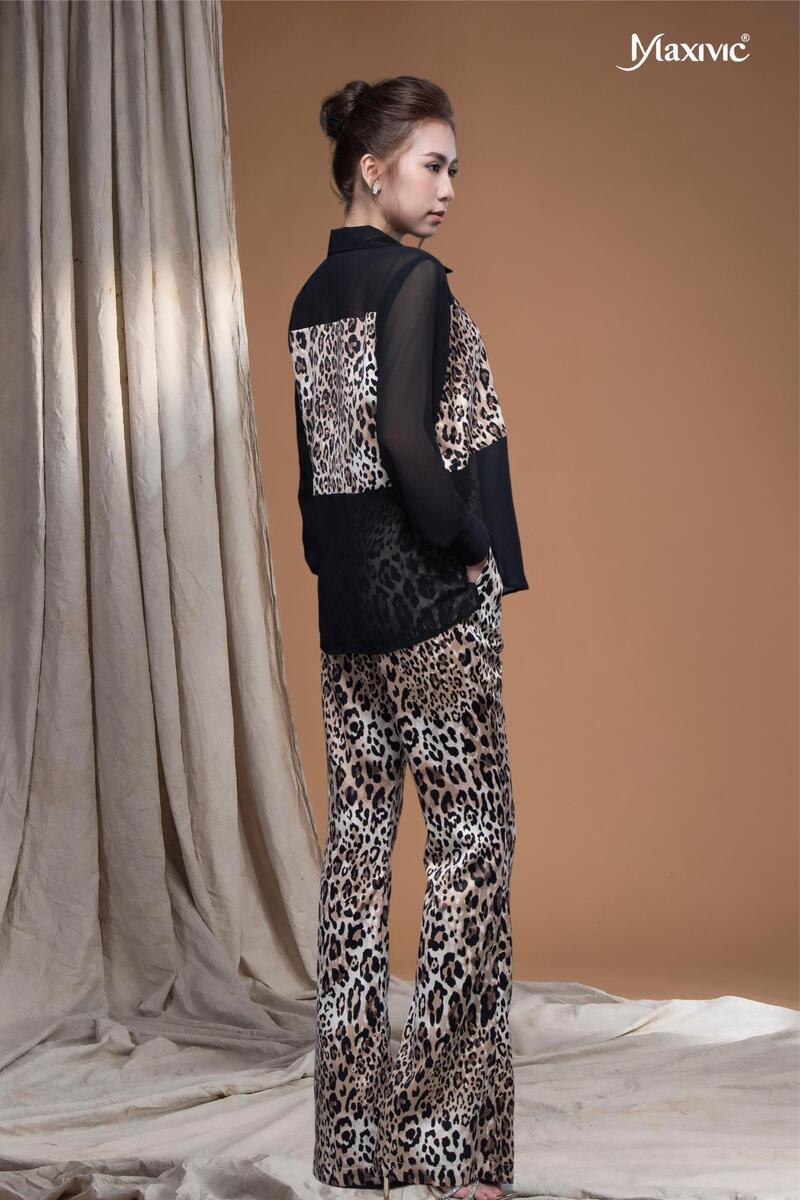 - Quần ống loe nhẹ, lưng cao hoạ tiết da beo giúp che khuyết điểm tốt, mang lại sự thanh lịch và thoải mái cho người mặc.