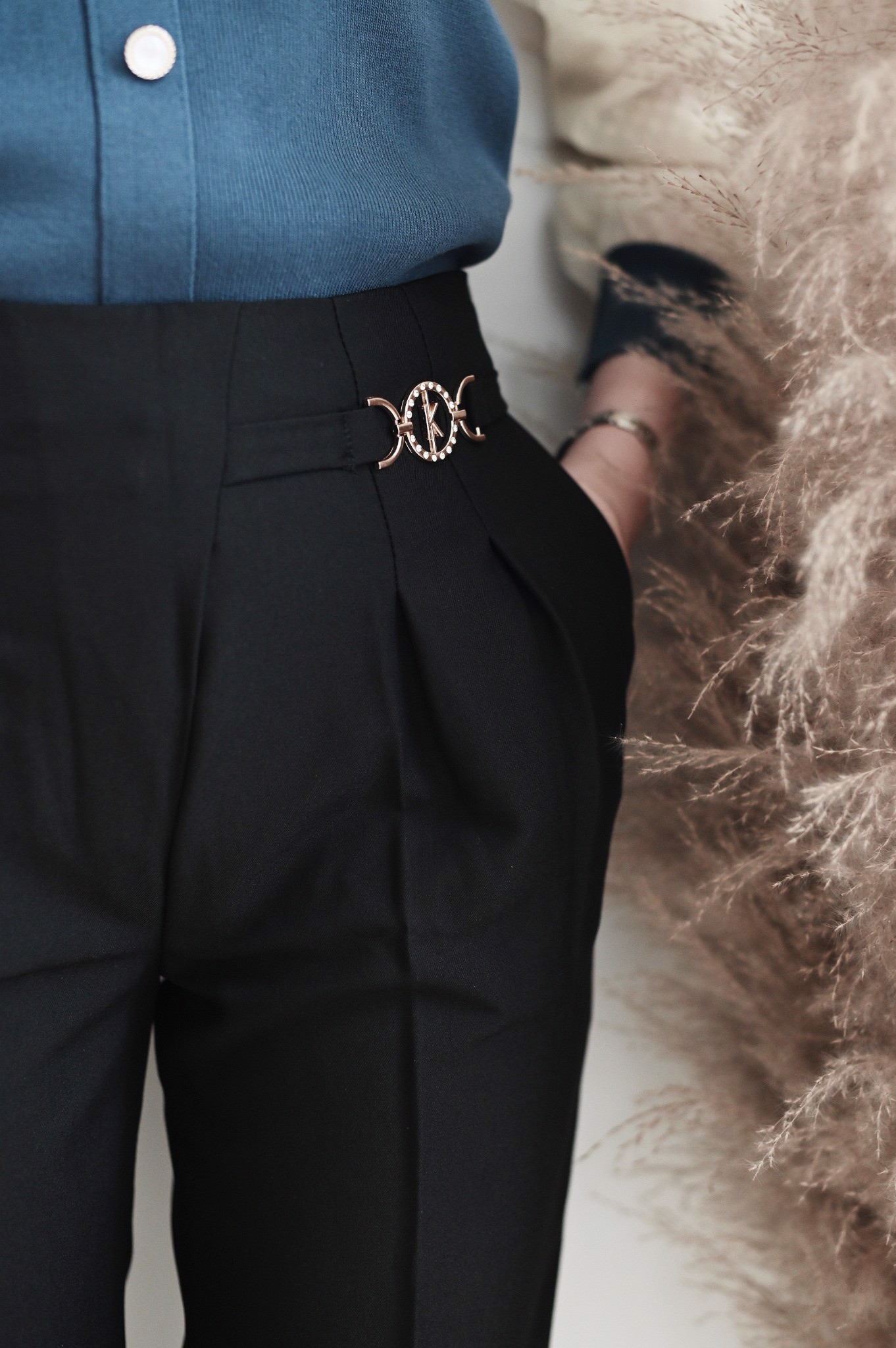 CHẤT LIỆU KAKI TÂY, DÀY DẶN ĐỨNG FORM QUẦN MÀU ĐEN FORM QUẦN ỐNG ĐỨNG, SUÔN THẲNG TẠO ĐÔI CHÂN DÀI PHẦN LAI QUẦN XẺ HAI BÊN TAG LOGO GẮN NGAY SƯỜN TÚI VÒNG EO