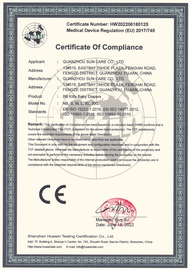 - Thiết kế siêu mỏng(2mm) nhưng thấm hút cao(1000ml) làm tã nhẹ và mềm mại cho bé thoả thích chơi đùa mà không lo bí bách. THÔNG TIN THƯƠNG HIỆU BB KITTY là thương hiệu của nhà sản xuất QUANZHOU SUN CARE CO., LTD với các sản phẩm BABY HEALTH CARE đã được đăng kí thương hiệu quốc tế được bảo hộ trên 10 quốc gia theo nghị định thư MARID trong đó có VIỆT NAM với các sản phẩm như: Bỉm, tã trẻ em, khăn giấy, khăn ướt, sữa tắm,ới dây chuyền sản xuất hiện đại(Nhật Bản), qui trình kiểm nghiệm khắt khe(DERMATEST- Đức) mang đến cho khách hàng sự an tâm cho từng sản phẩm. Được nhập khẩu chính ngạch & ủy quyền phân phối tại thị trường Việt Nam - Công ty TNHH xuất nhập khẩu GOONBEE - GOONBEE Store cam kết đem đến sản phẩm 100% chính hãng, chất lượng cao, an toàn và bảo vệ môi trường tới tất cả khách hàng. Cảm ơn các khách hàng đã tin tường và ủng hộ GOONBEE Store! Ngoài ra, BB KITTY còn đạt chứng nhận:
