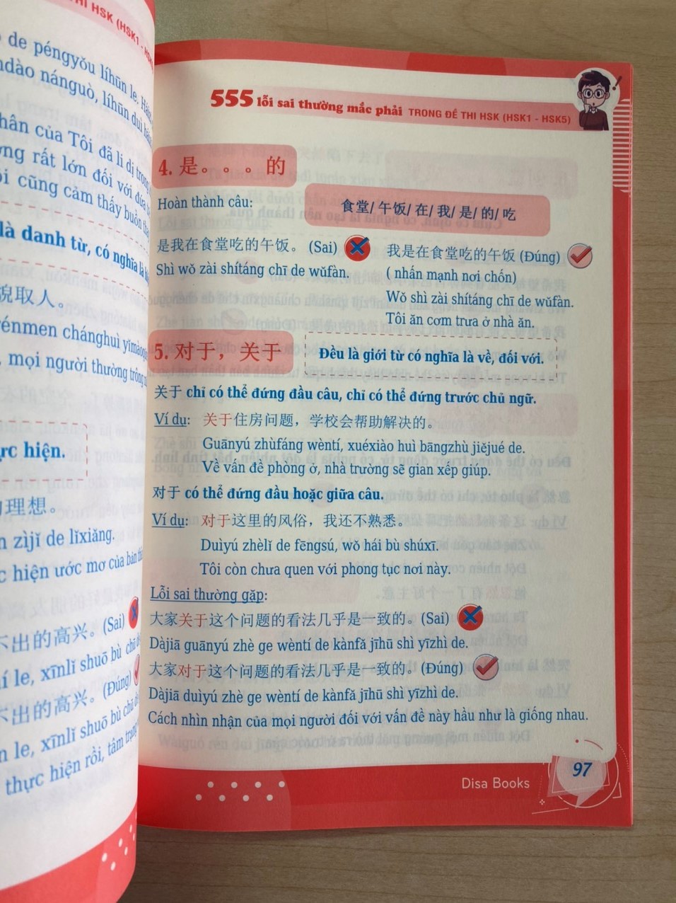 2. 555 Lỗi sai thường mắc phải trong đề thi HSK (HSK 3 đến HSK 5) Tác giả: Diệu Hồ Nhà Xuất Bản: NXB Thanh Niên Số Trang: 150 trang Trọng lượng (gr) 200 Hình thức Bìa Mềm Kích thước 17 x 24 cm Cuốn sách 555 lỗi sai thường mắc phải trong đề thi HSK được biên soạn dựa trên nỗi thấu hiểu mà nhiều người trong chúng ta hay mắc phải khi ôn tập các cấp thi từ HSK1 đến HSK5 nhằm giúp các bạn có thể nắm bắt những điểm quan trọng trong đề thi HSK và tiến hành ôn thi một cách khoa học, đạt hiểu quả tốt nhất. Các lỗi sai thường được tập trung ở các dạng như: hai từ cận nghĩa, hai từ có mặt chữ gần giống nhau, cấu trúc câu, các cụm từ cố định,…. Thường hay xuất hiện khi chọn đúng sai, điền từ cho sẵn vào chỗ trống, nhìn phiên âm điền từ còn thiếu, sắp xếp câu, chọn đáp án…Các lỗi sai này đều được bám sát với các đề thi chuẩn hiện nay nên chắc chắn sẽ làm hài lòng bạn đọc về hiểu quả mà nó mang lại. Sách in màu đẹp, hình ảnh bắt mắt gây cảm hứng tốt cho người đọc.