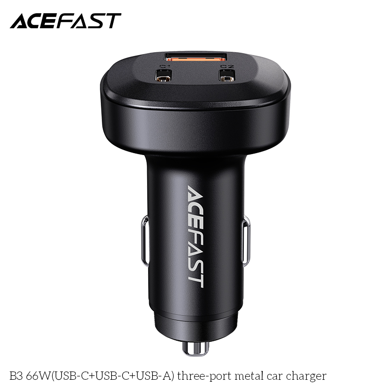 Mua tại TiktokBộ sạc ô tô ACEFAST B3, tổng công suất 66W, vật liệu thân bằng hợp kim nhôm, hỗ trợ hầu hết các giao thức sạc nhanh Thông số kỹ thuật: - Input: DC12-24V. - Output: USB-C1: 36W, USB-C2: 30W, USB-A: 30W, USB-C1 + USB-C2: 36W + 30W, USB-C1 + USB-A: 36W + 30W, USB-C1 + USB-C2 + USB-A: 5V / 5A. Hỗ trợ cho PD3.0, cho PPS, cho QC4.0, cho AFC, cho FCP, cho SCP và các giao thức sạc nhanh khác.