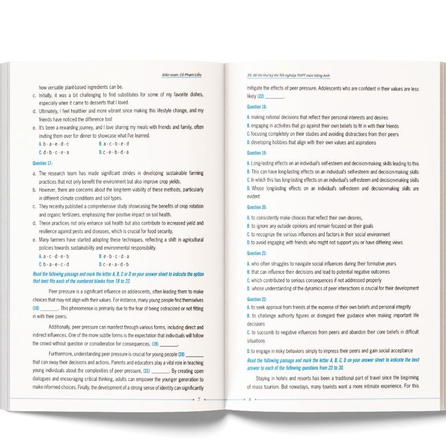 Từ tháng 10/2024, Bộ Giáo dục và Đào tạo cho đưa ra cấu trúc đề minh họa mới cho môn Tiếng Anh nhằm nâng cao chất lượng phân loại và đánh giá năng lực thực sự của thí sinh trong kỳ thi tốt nghiệp THPT. Những đổi mới trong kỳ thi yêu cầu thí sinh phải có chiến lược ôn luyện và học tập hiệu quả hơn. Đáp ứng nhu cầu cấp thiết đó, cuốn sách 35 Đề Thi Thử Kỳ Thi Tốt Nghiệp THPT Môn Tiếng Anh đã tổng hợp những đề thi bám sát cấu trúc mới, giúp học sinh làm quen với các dạng bài và rèn luyện kỹ năng làm bài một cách có hệ thống.