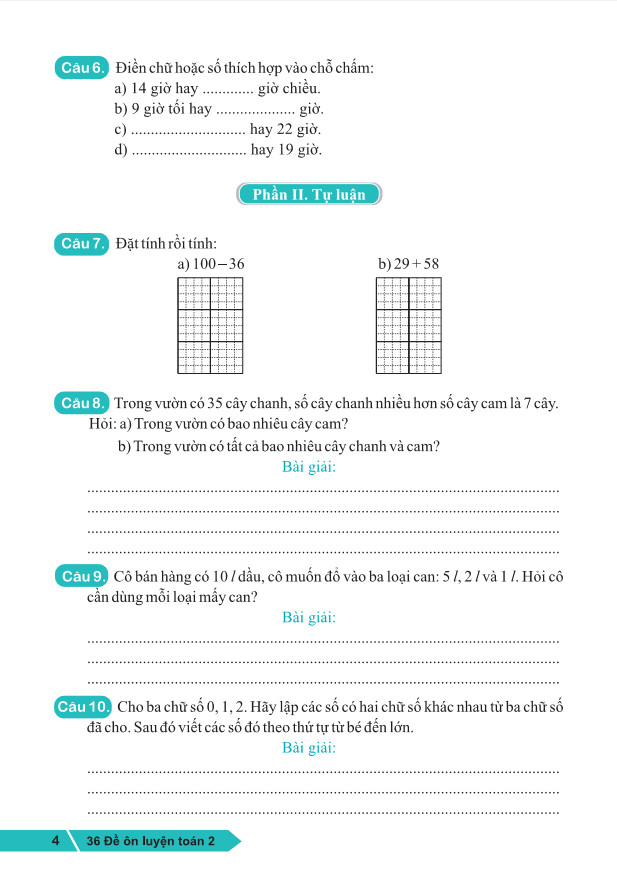 Để ôn luyện kiến thức kĩ năng cơ bản của môn Toán, đồng thời góp phần phục vụ yêu cầu bồi dưỡng học sinh khá giỏi môn Toán và giúp các em làm quen với hình thức kiểm tra, đánh giá kết quả học tập, nhóm tác giả đã biên soạn cuốn 36 Đề Ôn Luyện Toán 2