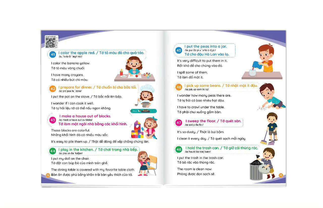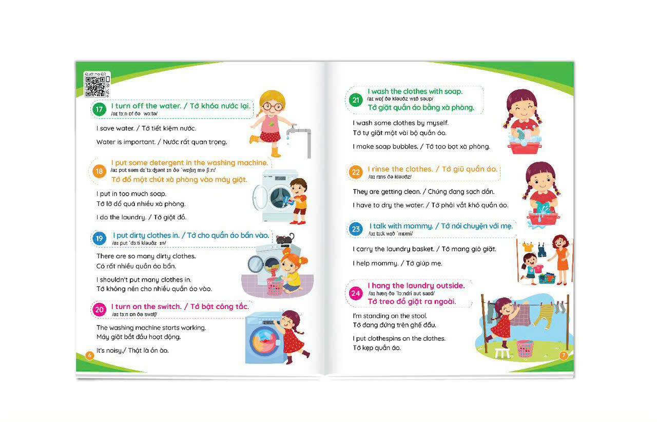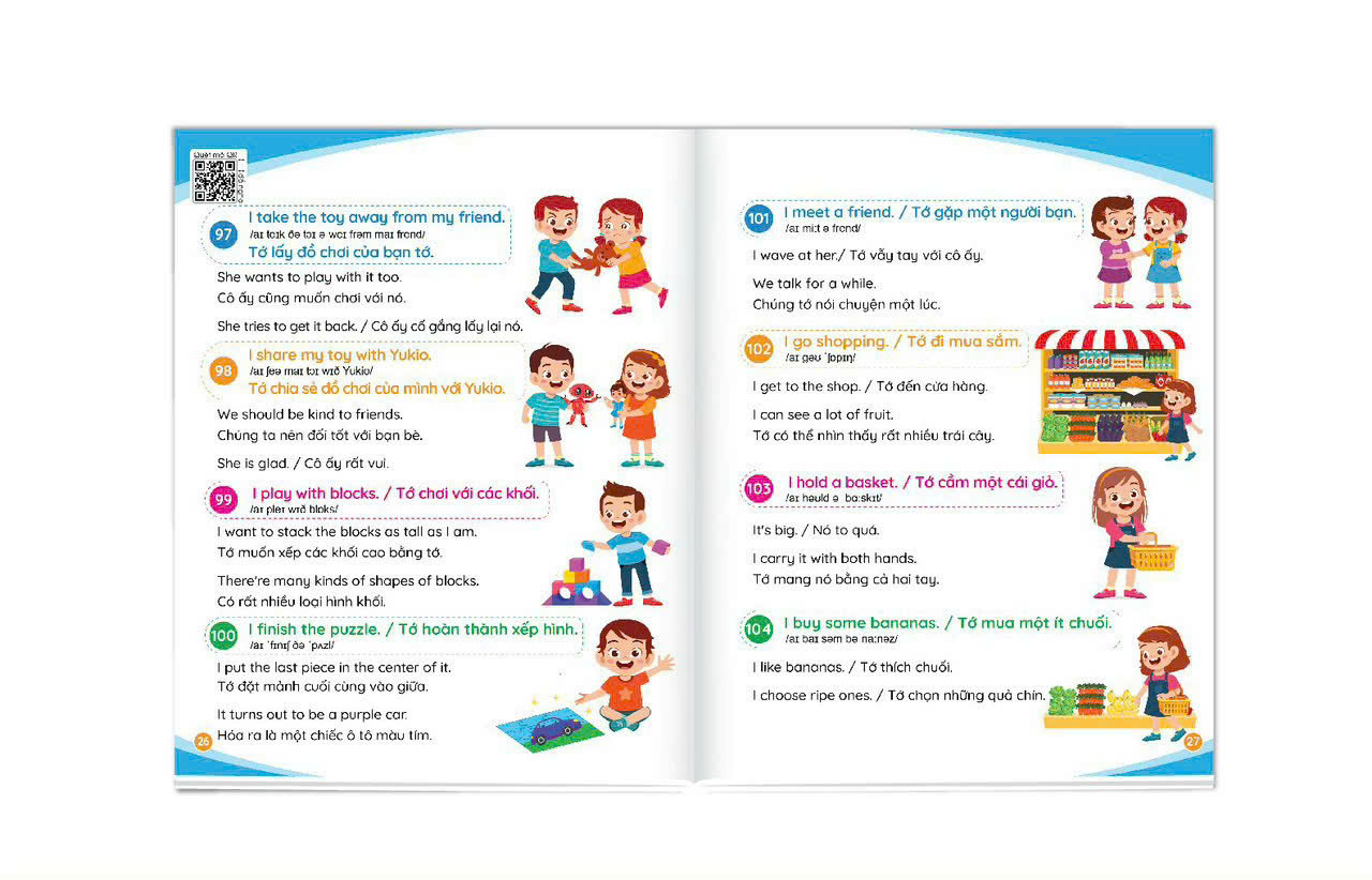 Mua tại TiktokSách 900 Câu Tiếng Anh Giao Tiếp Thường Dùng Hàng Ngày - Cẩm Nang Cho Mẹ Cùng Con Học Tiếng Anh Mỗi Ngày (Kèm File Nghe - Quét QR) GIỚI THIỆU SẢN PHẨM: Cuốn sách gồm 900 câu đàm thoại tiếng Anh để cha mẹ cùng con có thể giao tiếp về các chủ đề xung quanh cuộc sống hằng ngày, từ lúc thức dậy vào buổi sáng, đi học, đi chơi, đi siêu thị … cho đến lúc đi ngủ. Có cuốn sách này thì cha mẹ không lo bí từ, không biết nói tiếng Anh như thế nào cùng con. Đây là cuốn cẩm nang giúp cho cha mẹ có cơ hội học tập và giao tiếp tiếng Anh cùng con, để cả hai cùng tiến bộ mỗi ngày. Sách có kèm file nghe quét mã QR với giọng đọc tiếng Anh chuẩn để cha mẹ và con cùng nghe và tắm ngôn ngữ mỗi ngày. HƯỚNG DẪN BẢO QUẢN SÁCH THIẾU NHI: