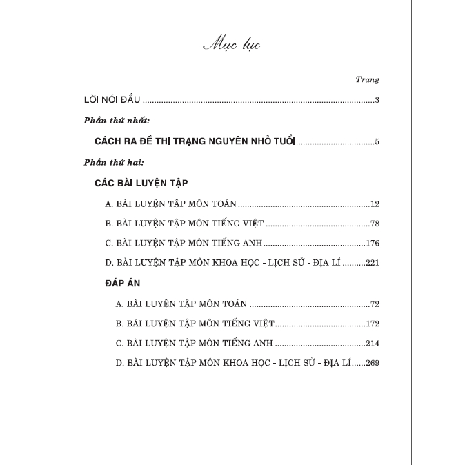 Các bài tập trong mỗi đề thi đều được chúng tôi chọn lọc trong chương trình học lớp 5 và được trình bày dưới hình thức trắc nghiệm. Ngoài ra mỗi đề thi đều có 3 câu tự luận nhằm phát triển kĩ năng trình bày bài cho học sinh. Hi vọng, cuốn sách sẽ là một tài liệu đồng hành cùng các em trong mỗi cuộc thi, đồng thời còn là một tài liệu tham khảo cho các bậc phụ huynh và các quý thầy cô giáo trong hướng dẫn các em luyện tập. Tác giả rất mong nhận được sự đóng góp ý kiến của bạn đọc để nội dung cuốn sách hoàn thiện hơn trong các lần tái bản sau.