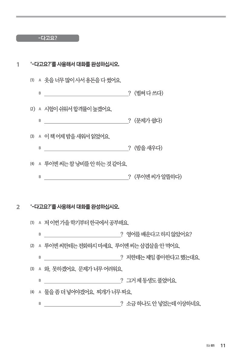 ● Phần 1: Luyện tập từ vựng, giúp người học ôn tập và luyện tập từ vựng, ứng dụng vào các câu, tình huống cụ thể. Các từ vựng được đưa ra trên cơ sở phù hợp với nội dung và chủ đề được học trong giáo trình Tiếng Hàn tổng hợp trung cấp 4.