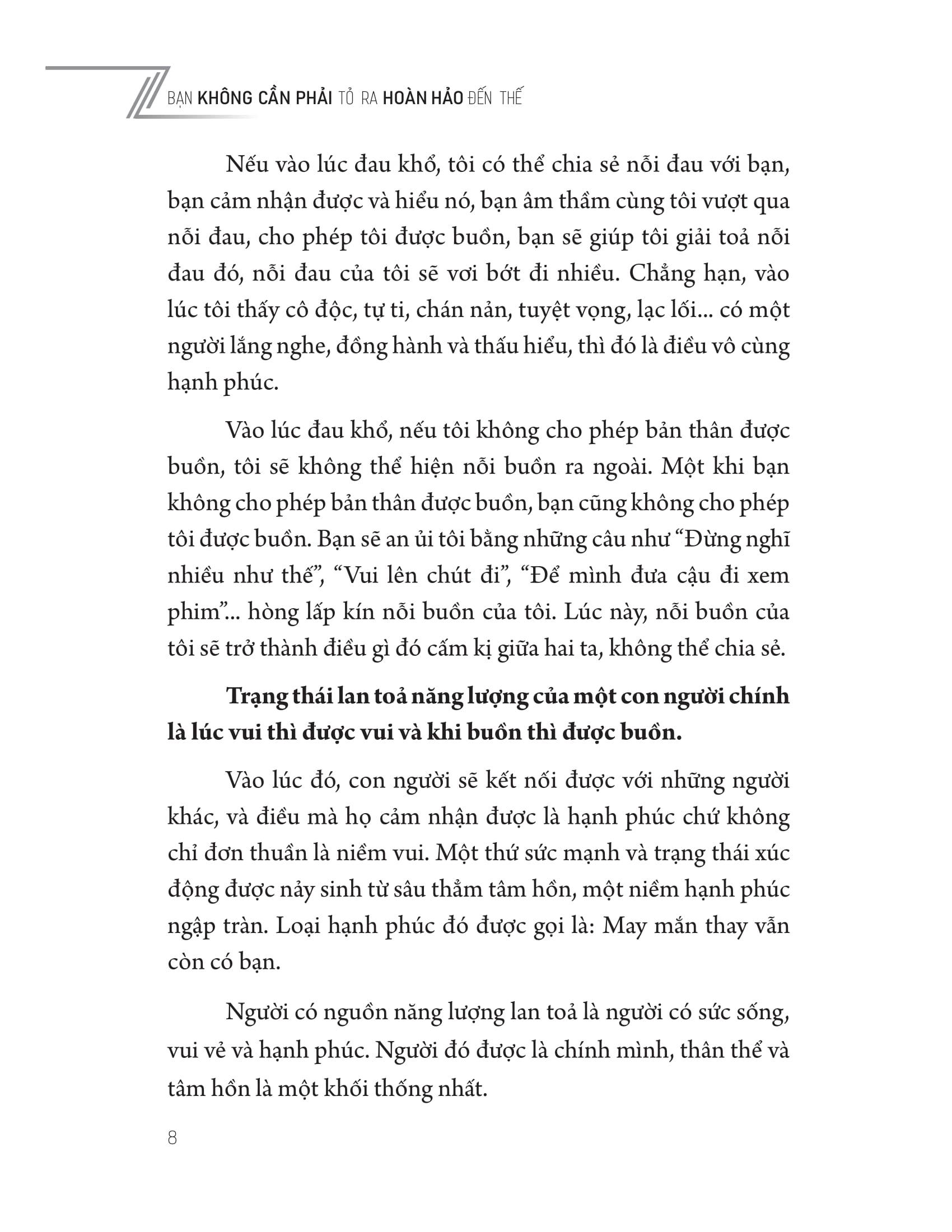 - Cuốn sách này sẽ hỗ trợ bạn thấu hiểu và chia sẻ cảm xúc của m.ình một cách tích cực và chân thành Ai cũng có lúc đau khổ, yếu mềm. Có thể bạn không chia sẻ nỗi đau của m.ình với tất cả mọi người, nhưng chỉ cần bạn xây dựng mối quan hệ với một vài người để bạn đủ tin tưởng chia sẻ những cảm xúc thật của m.ình, đời này coi như cũng đủ rồi. Bạn không cần phải lúc nào cũng thể hiện năng lượng tích cực, đôi khi, hãy chia sẻ cả sự yếu đuối và nỗi đau của bạn. Đó chính là cách để nâng cao mối quan hệ giữa bạn và người bạn tin tưởng, cũng như là để giúp chính bản thân bạn cảm thấy nhẹ nhàng hơn. Cuốn sách Bạn Không Cần Phải Tỏ Ra Hoàn Hảo Đến Thế sẽ hỗ trợ bạn đồng cảm, thấu hiểu và chia sẻ cảm xúc của m.ình một cách tích cực và chân thành; cũng như giúp bạn học cách yêu thươngvà được yêu thương, mở lòng m.ình với đối phương thật chân thực;từ đó bạn sẽ sống một cuộc đời nhẹ nhàng và ý nghĩa hơn! Bạn khôngcần phải tỏ ra hoàn hảo đến thế, hãy cùng học cáchchấp nhận và thương yêu cả những trầy xước của chính m.ình.