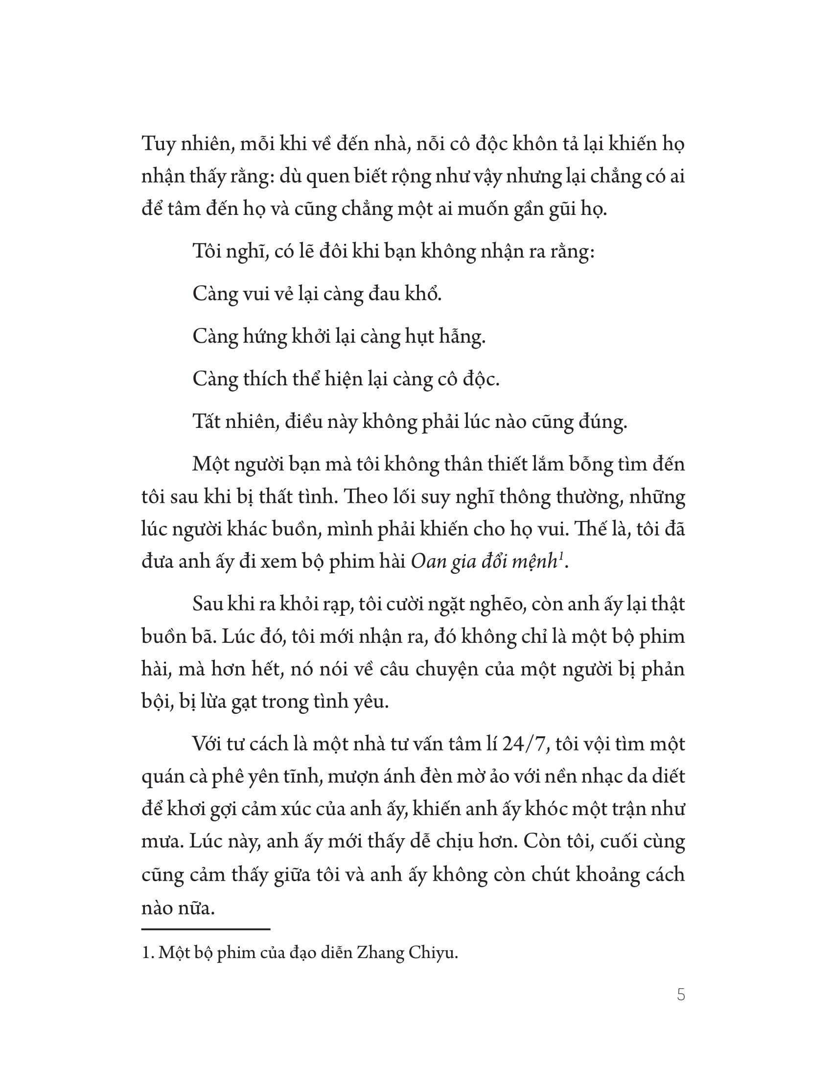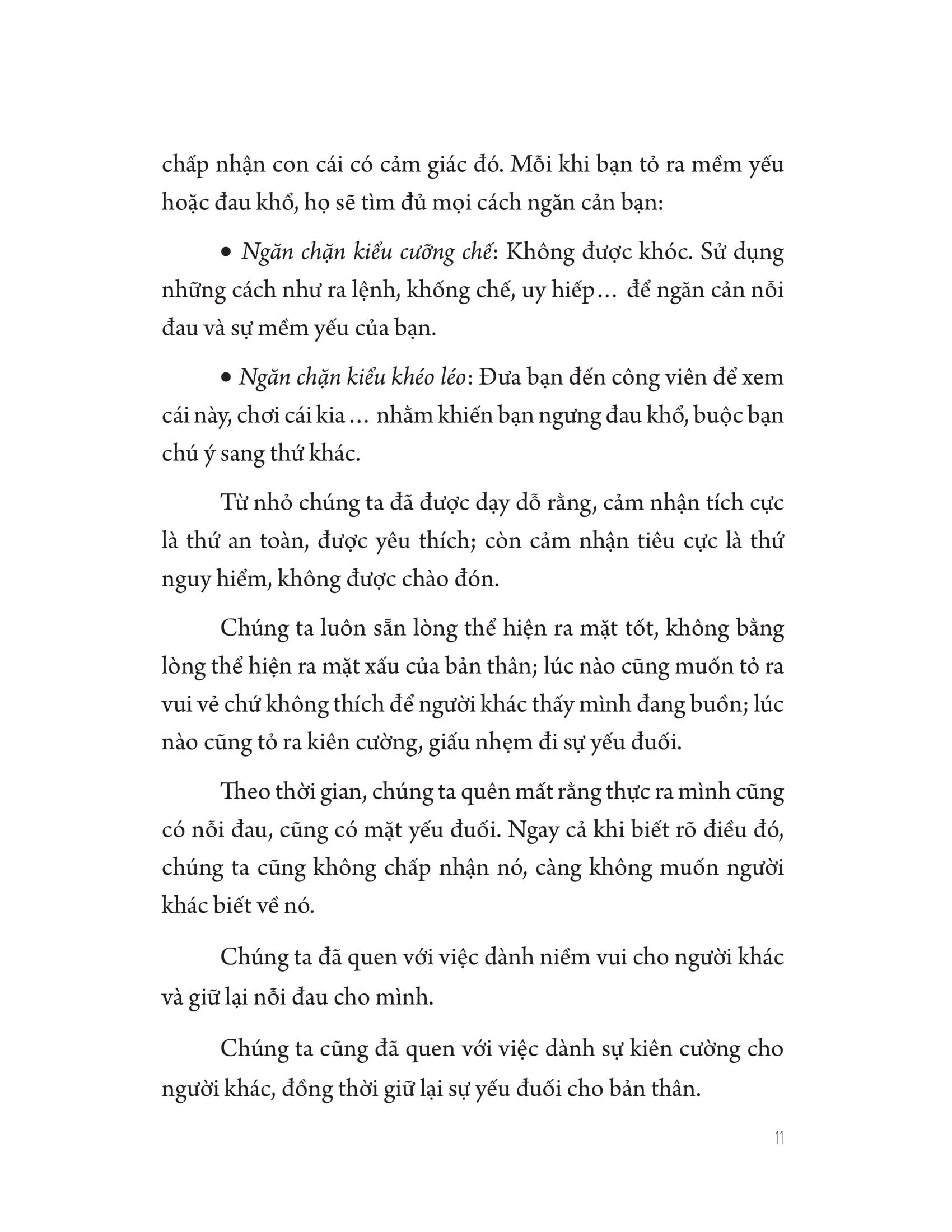 - Tích cực nhưng đừng tích cực độc hại! Từ nhỏ chúng ta đã được dạy rằng: cảm nhận tích cực là thứ an toàn, được yêu thích; còn cảm nhận tiêu cực là thứ nguy hiểm, không được chào đón. Chúng ta luôn sẵn lòng thể hiện ra mặt tốt, không bằng lòng thể hiện ra mặt xấu của bản thân: lúc nào cũng muốn tỏ ra vui vẻ chứ không thích để người khác thấy m.ình đang buồn; lúc nào cũng tỏ ra kiên cường, giấu nhẹm đi sự yếu đuối. Theo thời gian, chúng ta quên mất rằng thực ra m.ình cũng có nỗi đau, cũng có mặt yếu đuối. Ngay cả khi biết rõ điều đó, chúng ta cũng không chấp nhận nó, càng không muốn người khác biết về nó. Chúng ta đã quen với việc dành niềm vui cho người khác và giữ lại nỗi đau cho m.ình. Chúng ta cũng đã quen với việc dành sự kiên cường cho người khác, đồng thời giữ lại sự yếu đuối cho bản thân.