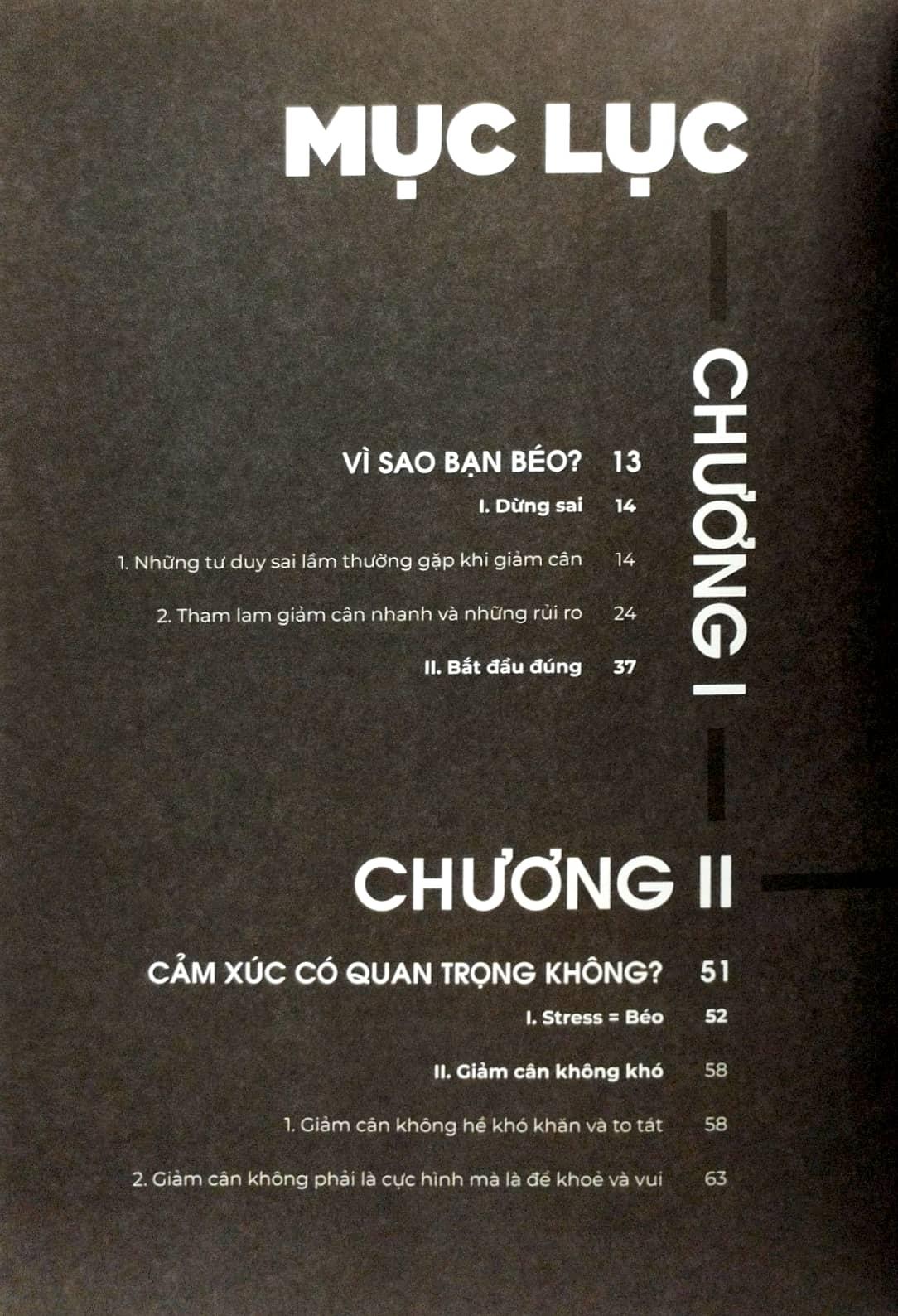 Chương I:Phân tích những tư duy vềgiảm cân sai cáchvàcách giảm cân khoa học(bao gồm những kiến thức của tác giả); Xây dựng nhận thức đúng đắn cho người đọc trong việc giảm cân.