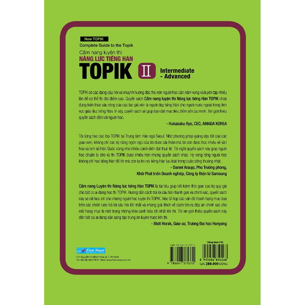 Cẩm nang Luyện thi Năng lực tiếng Hàn TOPIK được biên soạn dành cho người học chuẩn bị tham dự Kỳ thi Năng lực tiếng Hàn. TOPIK I tương ứng với trình độ Sơ cấp, còn TOPIK II tương ứng với trình độ Trung – Cao cấp của kỳ thi tiếng Hàn này.