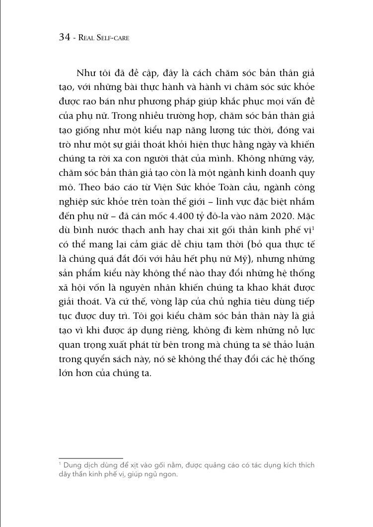 Ngày nay, khi nói đến “chăm sóc bản thân”, nhiều người nghĩ ngay đến những buổi spa thư giãn, khóa học yoga hay những phương pháp chăm sóc da, dưỡng tóc đắt tiền. Nhưng tất cả những điều đó có thật sự giúp chúng ta đạt được sự cân bằng và hạnh phúc không, hay chúng đơn thuần là những hình thức giải tỏa tạm thời để che đậy sự mệt mỏi và áp lực đang chồng chất? Đó chính là câu hỏi mà bác sĩ tâm thần chuyên về sức khỏe tinh thần phụ nữ Pooja Lakshmin đặt ra trong “Chăm sóc bản thân thật sự” (tựa gốc: Real self-care), một quyển sách đáng đọc trong thời đại phát triển bùng nổ của lĩnh vực chăm sóc sức khỏe thể chất và tinh thần.