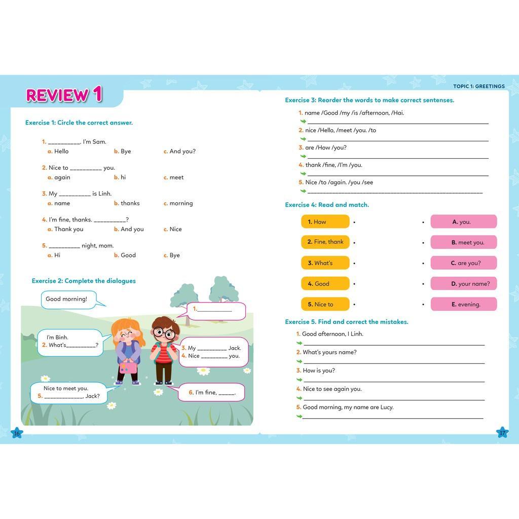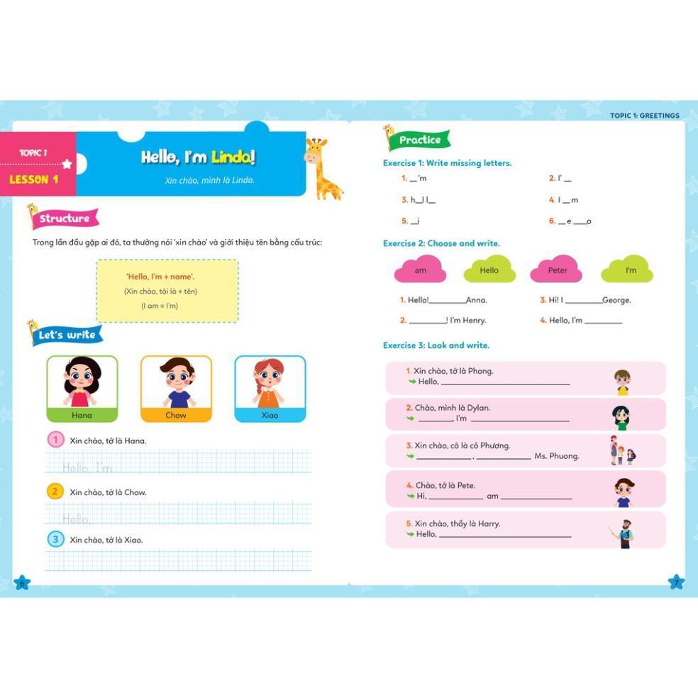 - Nội dung ngắn gọn, dễ học: 100 cấu trúc được gói gọn trong 10 chủ đề, mỗi chủ đề bao gồm 10 bài học Với các chủ đề quen thuộc và gần gũi trong cuộc sống như Greetings, Family & Friends, Study & School… không chỉ giúp các em tiếp thu kiến thức Ngữ pháp hiệu quả hơn mà còn biết cách vận dụng vào giao tiếp thực tế hàng ngày.