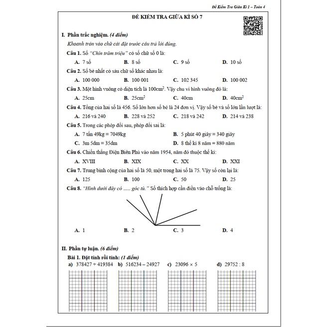 Đề kiểm tra học kỳ 2, môn toán lớp 4 năm 2020, Đề tham khảo số 1