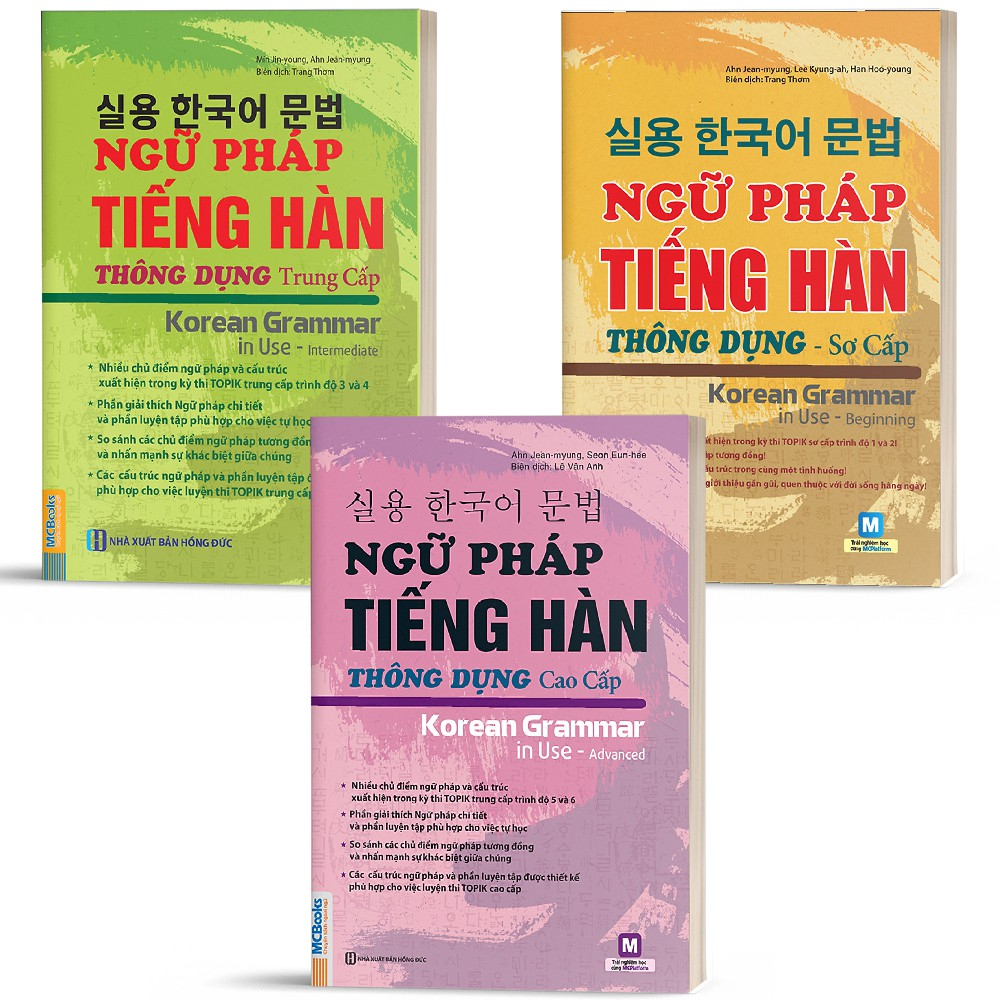 Combo "Combo Ngữ Pháp Tiếng Hàn Thông Dụng Sơ Cấp - Trung Cấp - Cao Cấp" gồm 3 cuốn từ trình độ sơ cấp, trung cấp đến cao cấp cho bạn học tiếng hàn thông