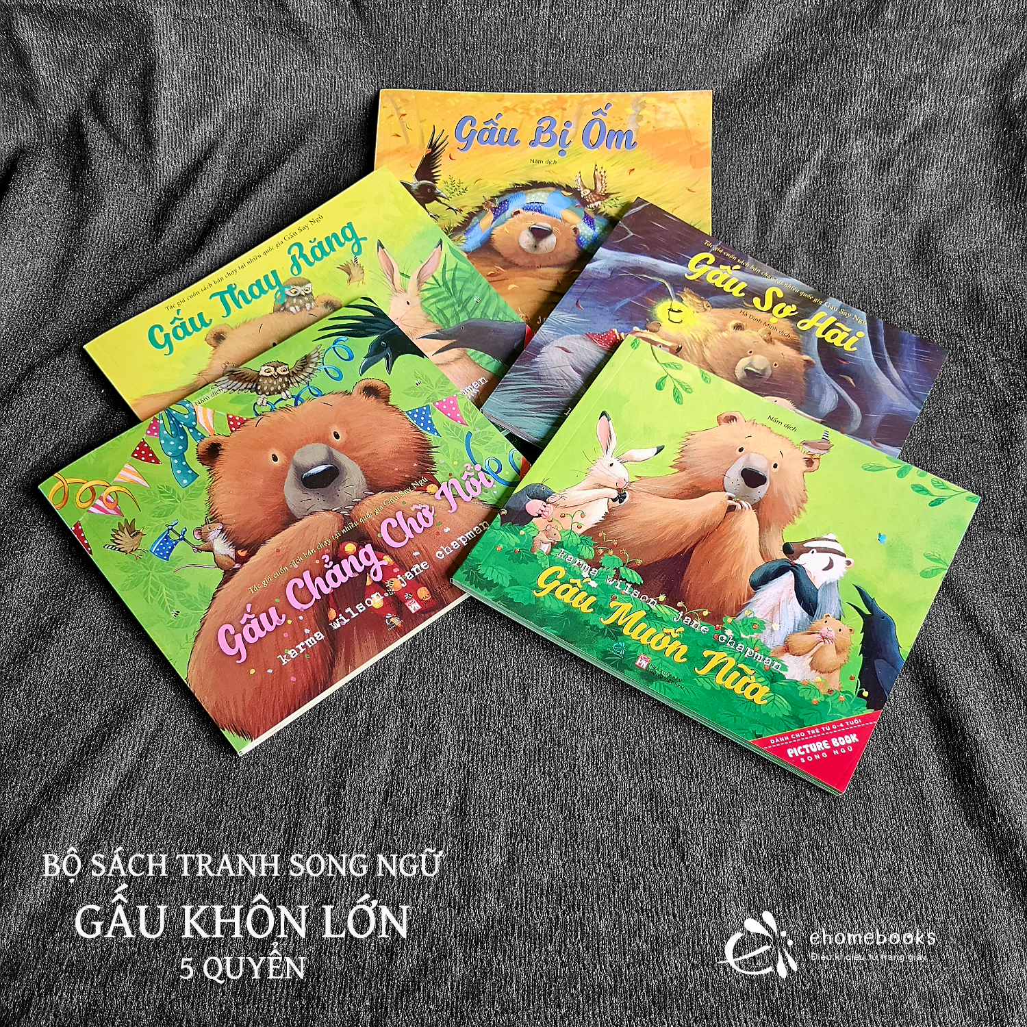 Bao gồm 5 cuốn sách: Gấu chẳng chờ nổi, Gấu muốn nữa, Gấu sợ hãi, Gấu thay răng, Gấu bị ốm.