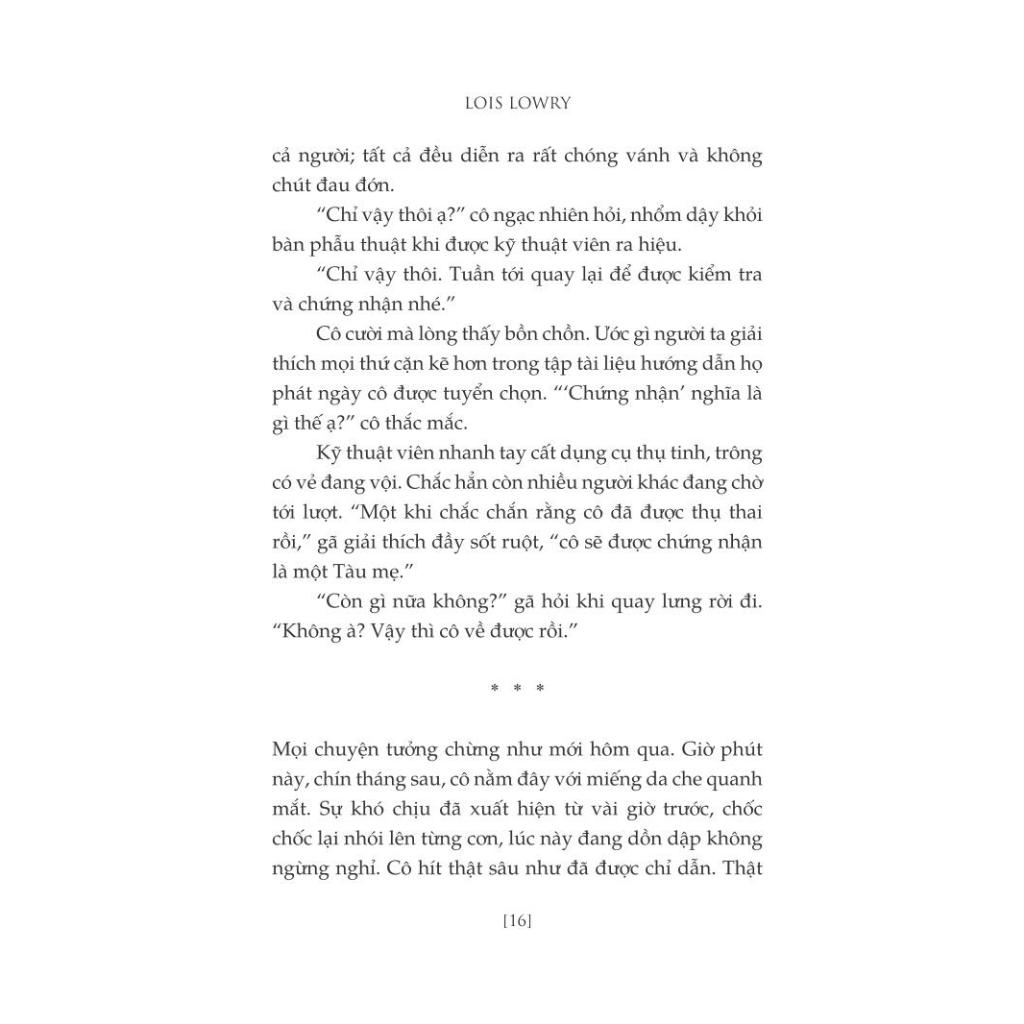 Phần thứ tư và cũng là cuốn cuối cùng của bộ truyện một lần nữa quăng người đọc trở lại thế giới lạnh lùng khủng khiếp của phần một Người truyền ký ức. Hồi kết hằng mong mỏi cho thiên truyện của Lois Lowry lên đến cao trào trong một trận đụng độ cuối cùng giữa cái thiện và cái ác. Nhưng rốt cuộc, còn đọng lại trong ta chẳng phải điều gì gay cấn hay sử thi như thế, mà mạnh mẽ và thấm thía: đó là tình yêu, sự bền bỉ và niềm hy vọng.