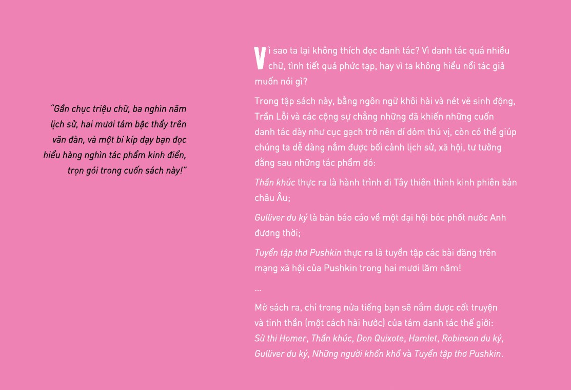 Trong tập sách này, bằng ngôn ngữ khôi hài và nét vẽ sinh động, Trần Lỗi và các cộng sự chẳng những dã khiến những cuốn danh tác dày như cục gạch trở nên dí dỏm thú vị, còn có thể giúp chúng ta dễ dàng nắm được bối cảnh lịch sử, xã hội, tư tường dằng sau những tác phẩm đó: