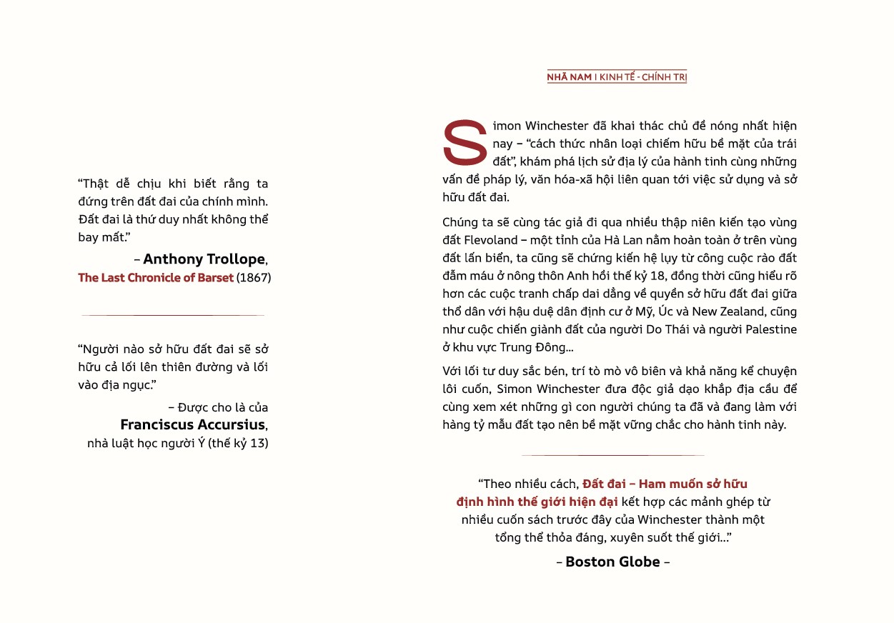 Chúng ta sẽ cùng tác giả đi qua nhiều thập niên kiến tạo vùng đất Flevoland – một tỉnh của Hà Lan nằm hoàn toàn ở trên vùng đất lấn biển, ta cũng sẽ chứng kiến hệ lụy từ công cuộc rào đất đẫm máu ở nông thôn Anh hồi thế kỷ 18, đồng thời cũng hiểu rõ hơn các cuộc tranh chấp dai dẳng về quyền sở hữu đất đai giữa thổ dân với hậu duệ dân định cư ở Mỹ, Úc và New Zealand, cũng như cuộc chiến giành đất của người Do Thái và người Palestine ở khu vực Trung Đông...