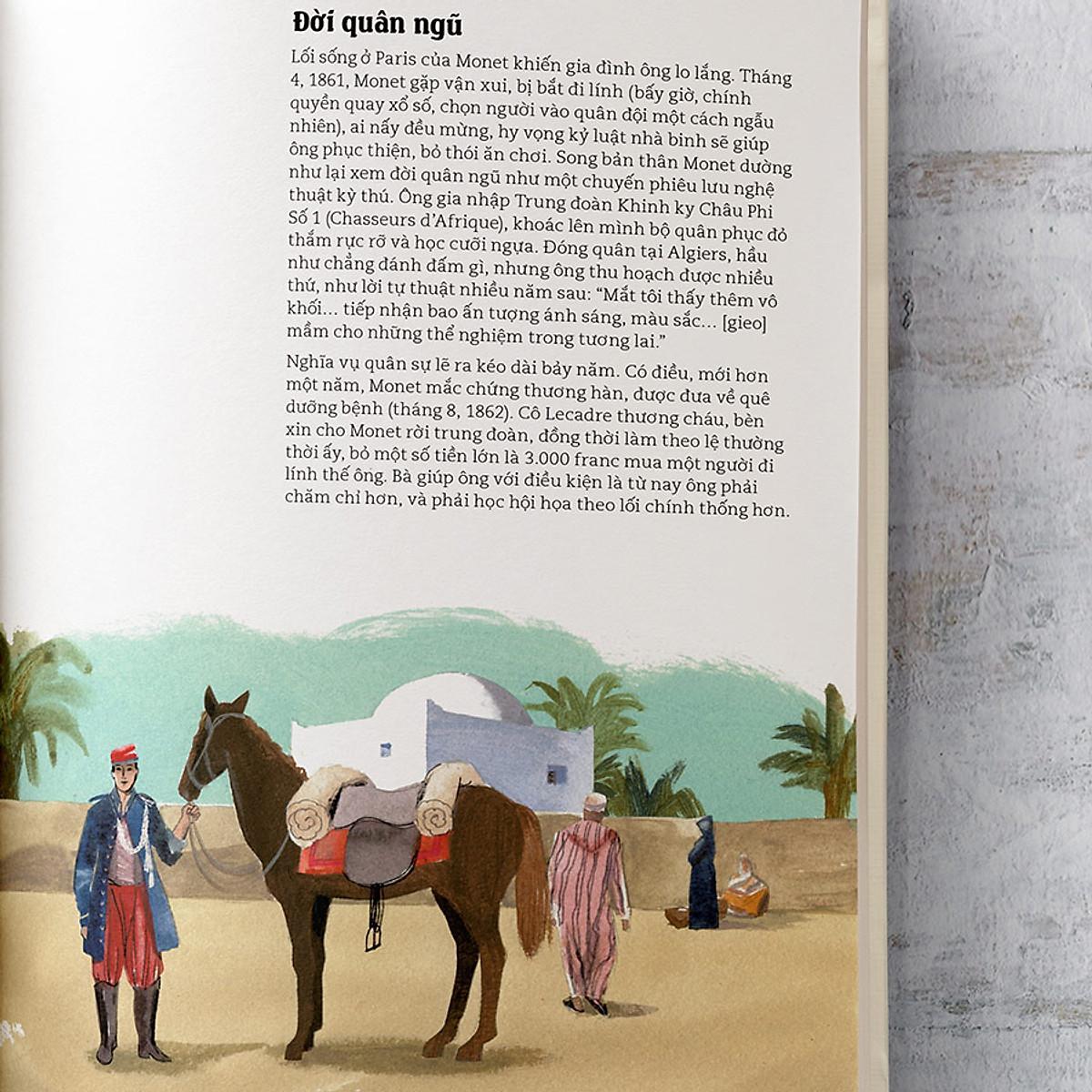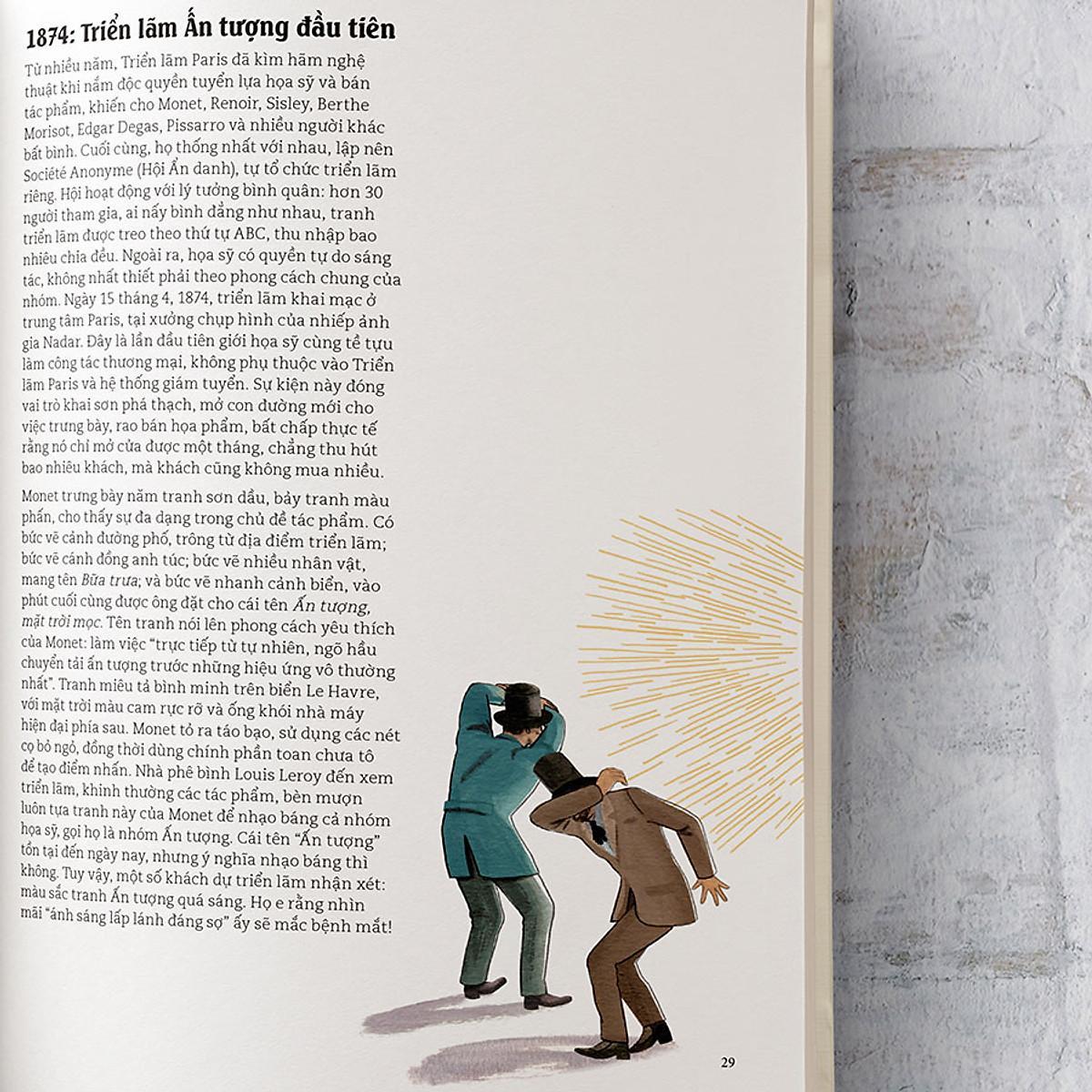 Ở cuốn sách này, bên cạnh câu chuyện cuộc đời, bạn cũng sẽ được ngắm nhìn các tác phẩm của Monet, từ những bức hí họa thuở thiếu thời, đến bức tranh bình minh trên cảng Le Havre với tên gọi Ấn tượng, mặt trời mọc - cái tên đã định danh cả một phong cách, một trường phái hội họa như ta đã biết. Bạn cũng sẽ được thấy những tác phẩm cuối đời vị danh họa, những tác phẩm mà sau đó vẫn để lại ảnh hưởng sâu sắc lên rất nhiều họa sĩ, dẫu khi cầm cọ vẽ những bức tranh ấy, thị lực của Monet đã suy giảm mạnh.
