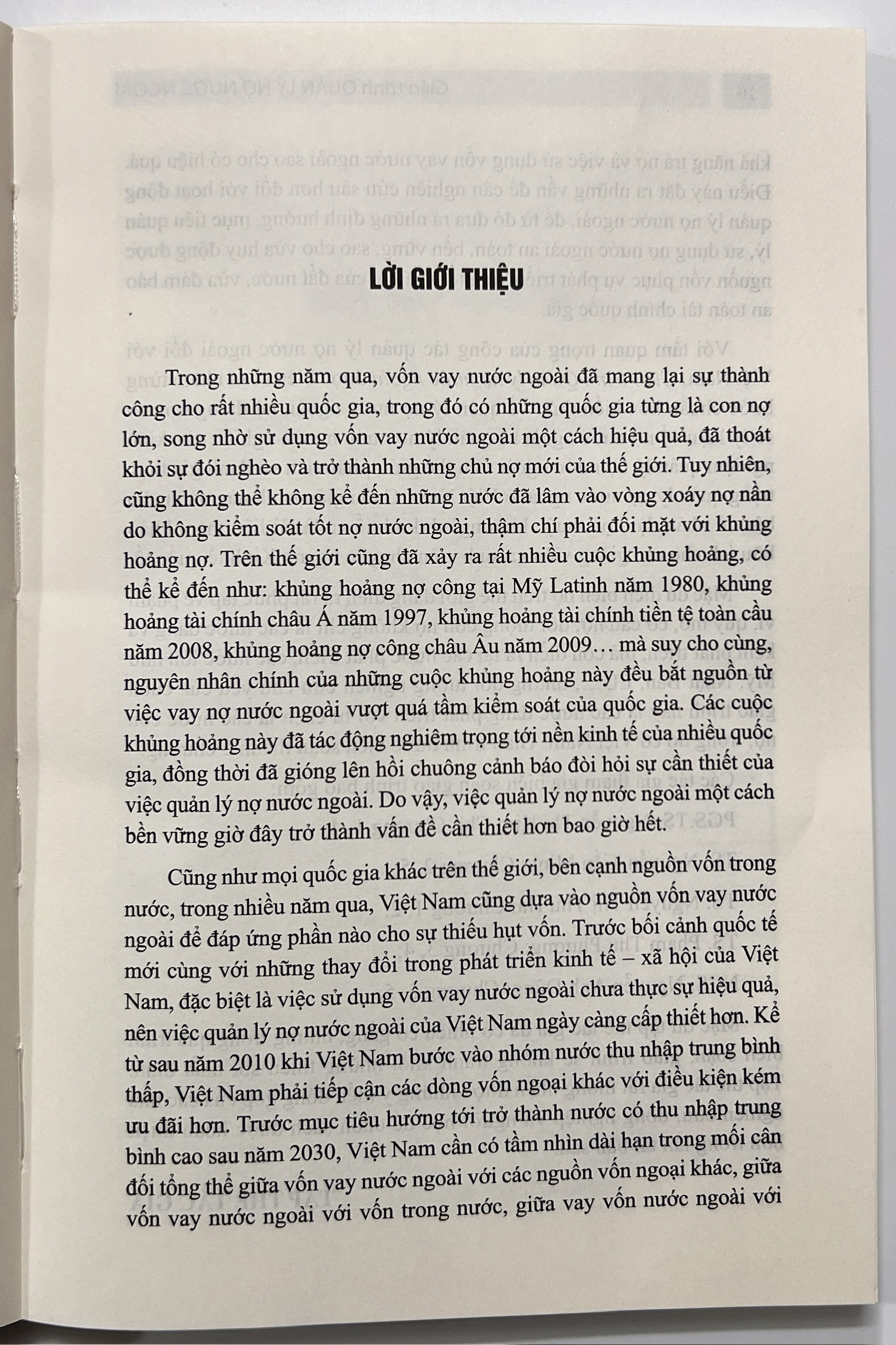 Việt Nam, Giáo trình Quản lý nợ nước ngoài được biên soạn nhằm từng bước chuẩn hóa kiến thức về quản lý nợ nước ngoài, hệ thống hóa cơ sở lý luận về nợ nước ngoài và quản lý nợ nước ngoài, nghiên cứu kinh nghiệm quản lý nợ nước ngoài trên thế giới, phân tích và đánh giá thực trạng quản lý nợ nước ngoài ở Việt Nam. Cuốn giáo trình này dành cho bậc cử nhân đại học thuộc khối ngành kinh tế và là tài liệu tham khảo hữu ích cho các giảng viên và sinh viên chuyên ngành Kinh tế quốc tế.