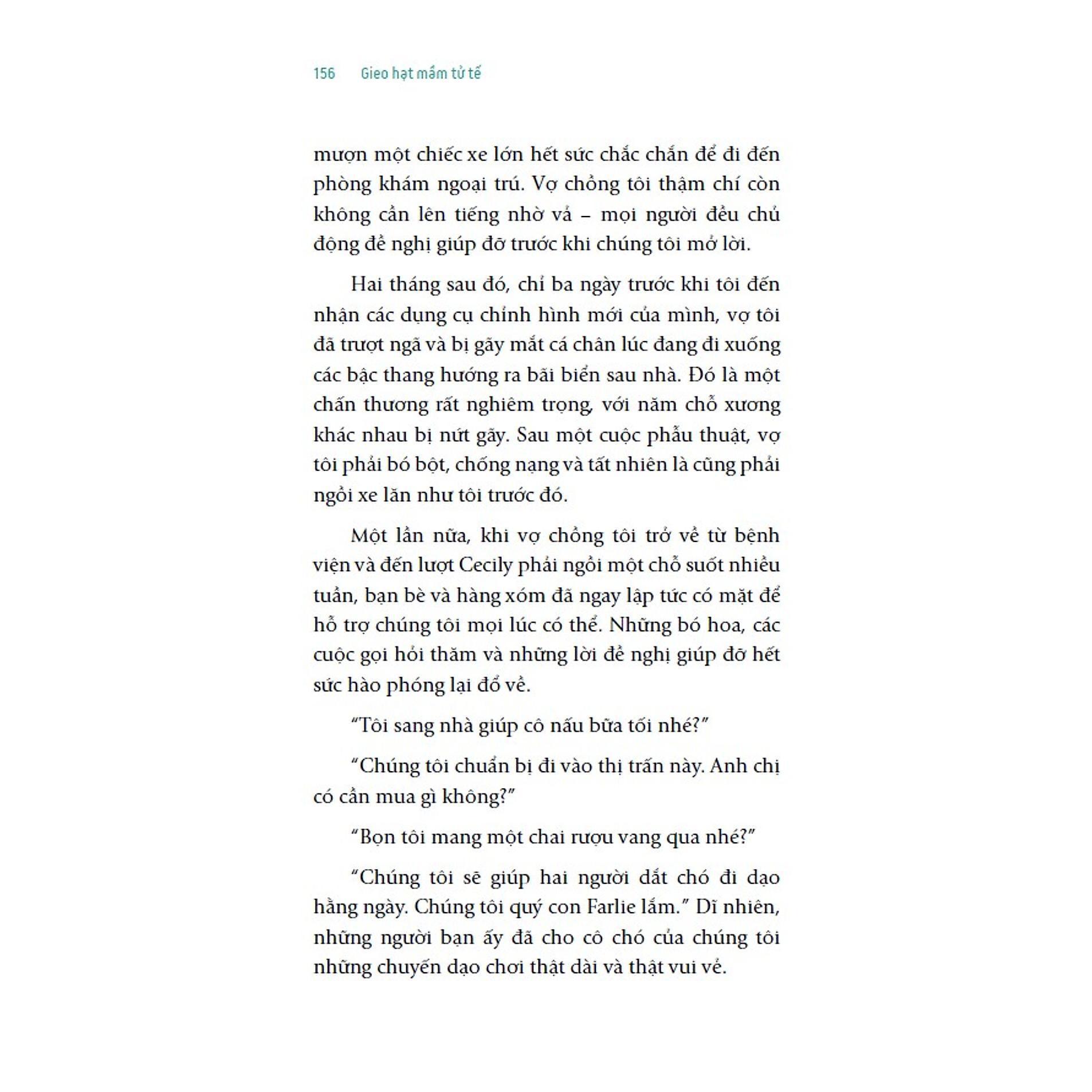 Ở thời đại mà những tin tức xã hội tiêu cực tràn ngập mặt báo, các chủ đề về bạo lực, chiến tranh hay tiêu đề giật gân về đời sống riêng tư của người nổi tiếng lại là từ khóa được nhiều người tìm kiếm, thật khó để tin rằng thế giới này vẫn còn tồn tại tình yêu thương, sự tử tế hay những hành động giúp đỡ vô điều kiện giữa người với người. Dù vậy, tử tế vẫn là một trong những điều tốt đẹp nhất mà chúng ta có thể trao cho nhau. Sự tử tế không nhất thiết phải là những việc quá lớn lao, mà chúng có thể bắt nguồn từ những hạt mầm bé nhỏ được ta “gieo trồng” mỗi ngày. Đó có thể chỉ là những hành động đơn giản và ngẫu nhiên, nhưng theo thời gian, với “sự chăm bón” đúng cách, chúng có thể tạo nên những thay đổi lớn lao không chỉ cho mỗi cá nhân mà còn cho cộng đồng và thế giới. Đây cũng chính là thông điệp nhân văn mà quyển sách mang đến cho độc giả. Quyển sách gồm 27 câu chuyện đời thường đầy gần gũi và cảm động nói về lòng tốt và sự tử tế trong cuộc sống. Với văn phong giản dị nhưng không kém phần sâu sắc, khiến bạn cảm nhận được tình yêu thương vẫn luôn tồn tại dù cuộc đời này có khắc nghiệt đến đâu đi nữa. Và bạn sẽ nhận ra rằng khi bạn dịu dàng với thế giới này, bạn cũng sẽ nhận lại sự dịu dàng từ thế giới. Nối tiếp chủ đề ý nghĩa về sự tử tế của Bộ sách Hạt Giống Tâm Hồn, không mang đến những câu chuyện truyền cảm hứng về cuộc đời của một vĩ nhân hay một người nổi tiếng nào, mà quyển sách chứa đựng những câu chuyện bình dị mà ta dễ dàng bắt gặp trong cuộc sống hằng ngày. Đó có thể là câu chuyện của cậu bé Arthur cực kỳ thông minh nhưng mắc chứng tự kỷ sẵn sàng nhường đĩa bánh tiramisu yêu thích cho một người ăn xin bên đường. Hay câu chuyện về bác tài xế Mike tốt bụng cho hai cô sinh viên bị hỏng xe đi nhờ một đoạn đường giữa đêm bão tuyết, nhờ vậy mà vô tình cứu hai cô gái thoát khỏi vụ tai nạn kinh hoàng chỉ vài phút sau đó. Và còn nhiều câu chuyện nhân văn giàu ý nghĩa khác sẽ chạm đến trái tim bạn. Những cung bậc cảm xúc len lỏi trên từng trang sách sẽ giúp bạn nhận ra cuộc sống vốn muôn màu muôn vẻ. Mỗi người mà ta gặp trên đường đời này không ai là ngẫu nhiên và những hành động tử tế của bạn dành cho họ không điều gì là vô ích. Cũng trong quyển sách này, bạn sẽ bắt gặp được hình ảnh của chính mình, của những người xung quanh, hoặc đứng ở vị trí “người ngoài cuộc” để chiêm nghiệm, khám phá những điều thật sự ý nghĩa và tìm ra châm ngôn sống cho chính mình. Khép lại quyển sách , hy vọng bạn sẽ có thêm động lực để yêu thương bản thân và những người xung quanh bằng cách giúp đỡ mọi người, ngay cả khi đó là một hành động nhỏ. Hy vọng những hạt mầm tử tế từ những việc nhỏ này sẽ được gieo trong tâm hồn bạn, để từ đó được bạn vun trồng, tưới mát rồi có một ngày bạn sẽ nhận được quả ngọt mà hạt mầm nhỏ ấy mang lại.