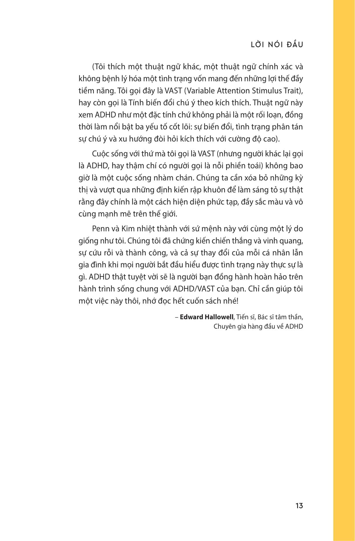 Nội dung sách được chia thành ba phần. Ở phần đầu, Penn và Kim giải thích ADHD là gì, nguyên nhân từ đâu, biểu hiện ra sao ở trẻ em, người lớn, phụ nữ và các nhóm khác nhau. Bạn sẽ nhận ra những hiểu lầm phổ biến – như việc cho rằng ADHD đồng nghĩa với “thiếu tập trung” hay “lười biếng”, thực chất chỉ là kết quả của sự thiếu hiểu biết về cách não bộ ADHD xử lý thông tin. Phần hai tập trung vào việc thay đổi câu chuyện mà chúng ta vẫn thường kể về ADHD. Thay vì chỉ nói về khuyết điểm và hạn chế, tác giả chỉ ra những khía cạnh tích cực, cả trong công việc, sáng tạo, mối quan hệ và cuộc sống. Cuối cùng, phần ba đưa ra những chiến lược thực tiễn: cách quản lý năng lượng, xây dựng thói quen, điều chỉnh môi trường sống, hoàn thành mục tiêu và chăm sóc bản thân.