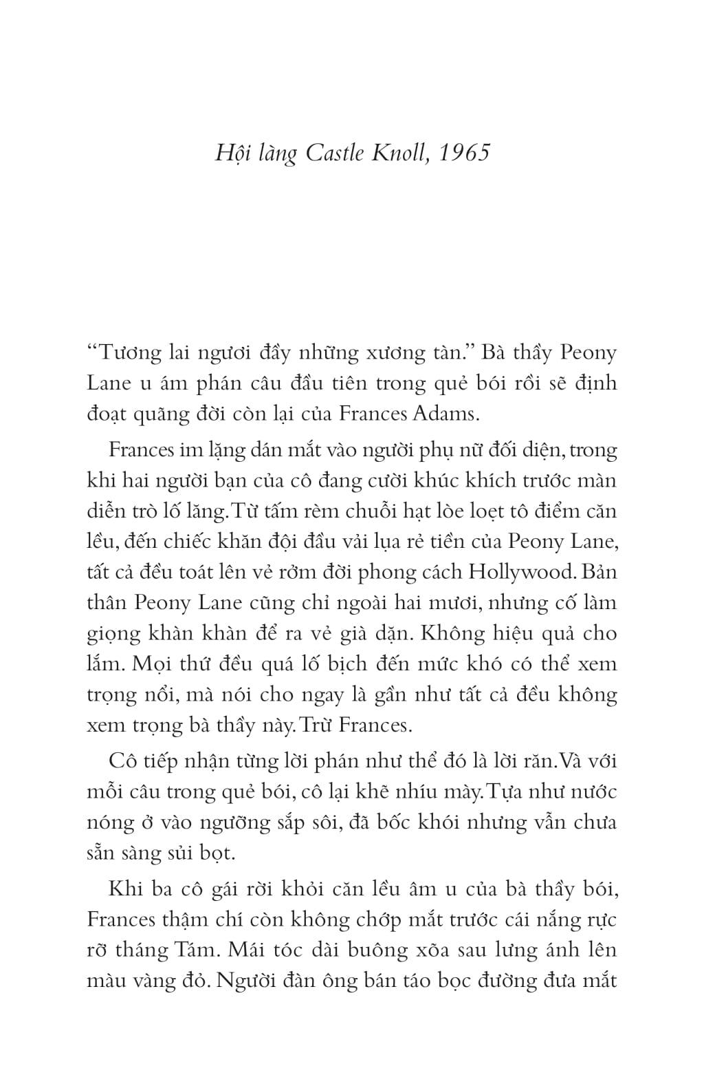 Một quẻ bói được đưa ra vào năm 1965: Tương lai ngươi đầy những xương tàn. Ngươi phải đi dần vào cái chết ngay khi một tay nắm giữ vương hậu. Cần có ý tứ với loài chim, bởi nó sẽ phản bội ngươi. Kể từ đó không còn đường lui lại. Nhưng những người con gái là chìa khóa công lý, phải tìm đúng một người thích hợp rồi giữ cạnh bên. Mọi dấu hiệu chỉ thẳng vào vụ án mạng của ngươi. Bị ám ảnh bởi quẻ bói này, Frances Adams đã không ngừng thu thập bí mật của tất cả người dân Castle Knoll, nhằm tìm ra kẻ sát hạt m.ình trước cả khi vụ án xảy ra. Và Frances Adams rồi cũng chết ở tuổi bảy mươi; người cháu họ, Annie Adams, được mời đến dinh tự Gravesdown để giải quyết vụ án mạng này.