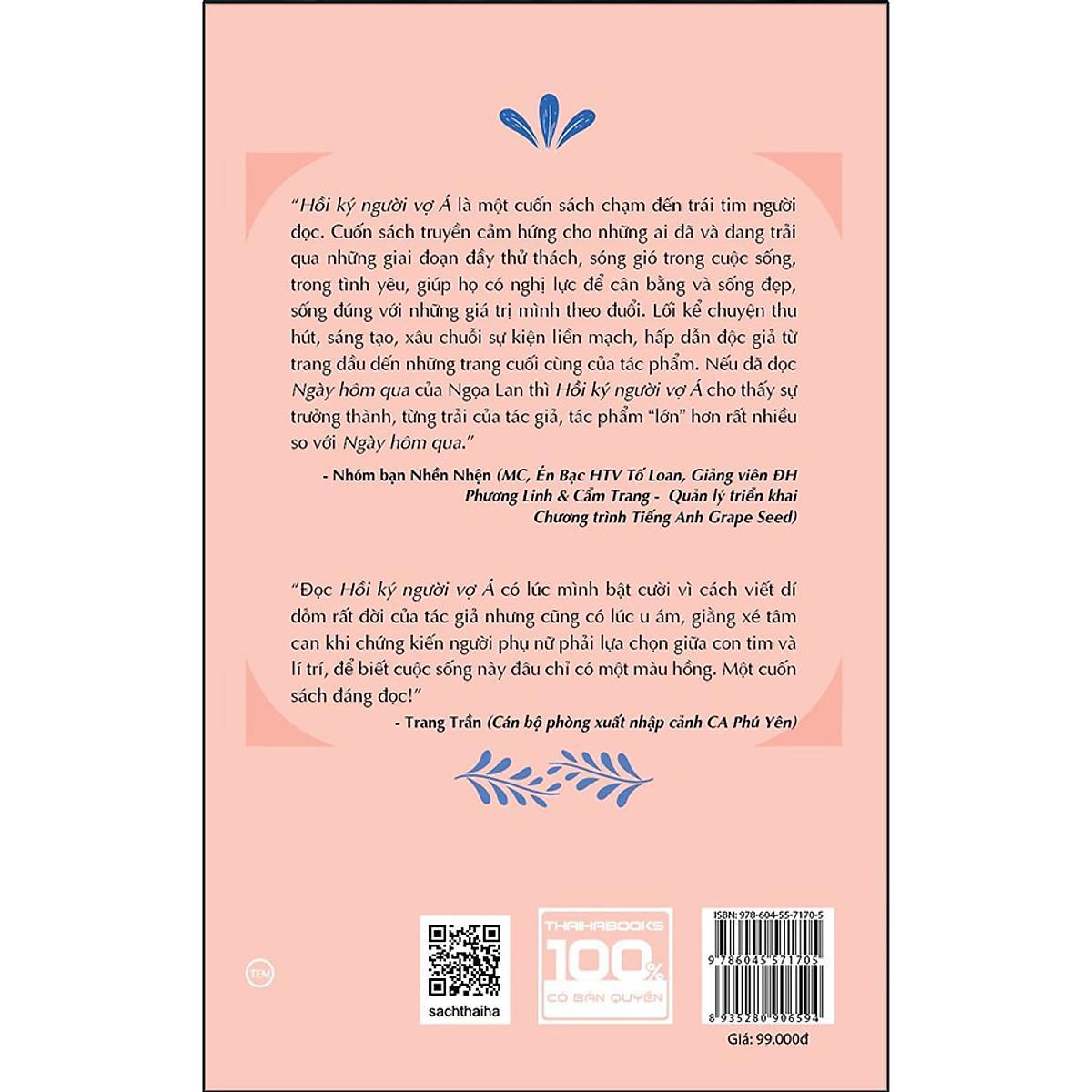 “Đọc Hồi ký người vợ Á có lúc mình bật cười vì cách viết dí dỏm rất đời của tác giả nhưng cũng có lúc u ám, giằng xé tâm can khi chứng kiến người phụ nữ phải lựa chọn giữa con tim và lí trí, để biết cuộc sống này đâu chỉ có một màu hồng. Một cuốn sách đáng đọc!”