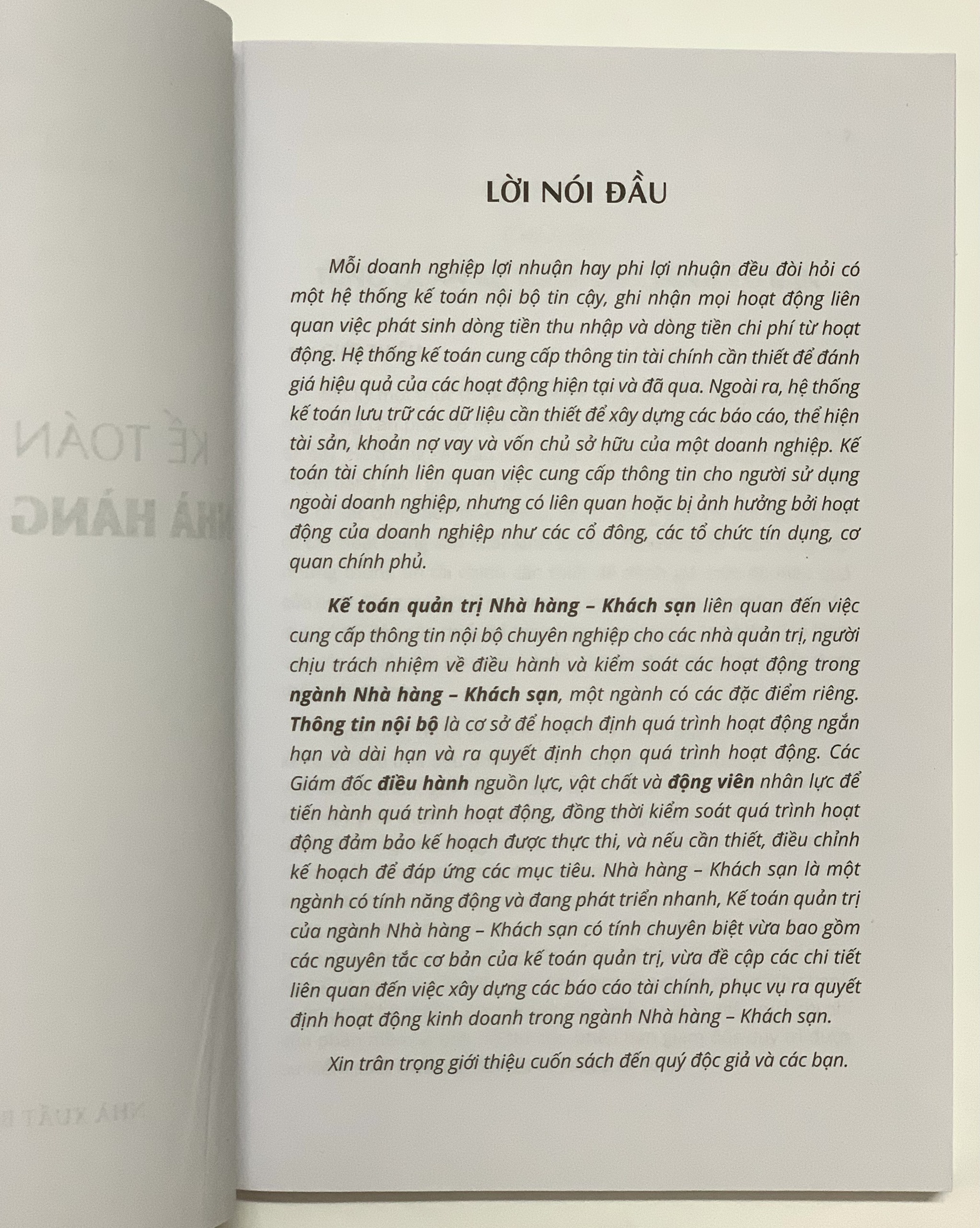 Thông tin nội bộ là cơ sở để hoạch định quá trình hoạt động ngắn hạn và dài hạn và ra quyết định chọn quá trình hoạt động. Các Giám đốc điều hành nguồn lực, vật chất và động viên nhân lực để tiến hành quá trình hoạt động, đồng thời kiểm soát quá trình hoạt động đảm bảo kế hoạch được thực thi, và nếu cần thiết, điều chỉnh kế hoạch để đáp ứng các mục tiêu. Nhà hàng – Khách sạn là một ngành có tính năng động và đang phát triển nhanh, Kế toán quản trị của ngành Nhà hàng – Khách sạn có tính chuyên biệt vừa bao gồm các nguyên tắc cơ bản của kế toán quản trị, vừa đề cập các chi tiết liên quan đến việc xây dựng các báo cáo tài chính, phục vụ ra quyết định hoạt động kinh doanh trong ngành Nhà hàng – Khách sạn.